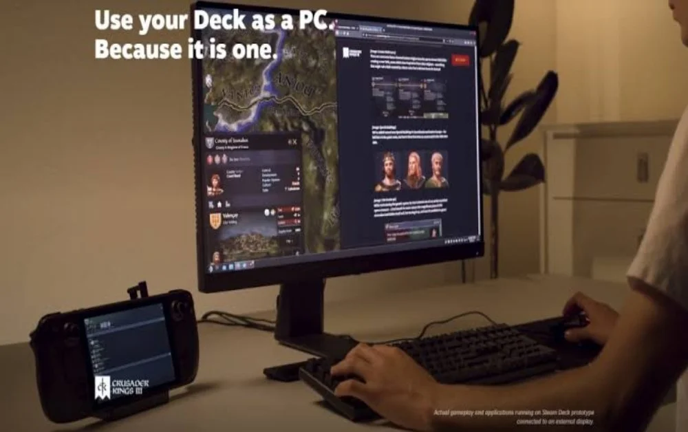 Além disso, você pode se livrar do SteamOS, instalar o Windows e apenas usar o Deck como um PC móvel normal, desde que tenha um mouse e um teclado à mão. E você pode até conectar o deck a outro PC e usá-lo como um controlador com uma tela gigante no meio.
