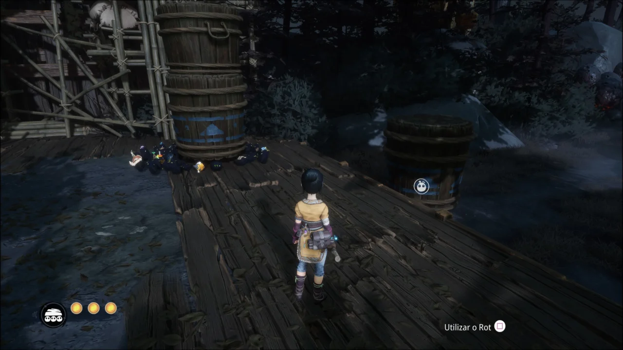 Siga alguns passos para o norte e então oeste até um portão de madeira. Use Pulsar no cristal pendurado na madeira para obter 10 Gemas. Pule nas plataformas de madeira e acerte uma flechada no alvo para girar o guindaste com uma plataforma. Pule na plataforma quando ela passar, mas não desça ainda na plataforma baixa de madeira ao sul. Espere o guindaste levar a plataforma para oeste, e então salte na plataforma de madeira a oeste. Vá para a direita e abra o baú para obter o Rot (Campos): 5/25. Depois atire no alvo para girar o guindaste, então suba na plataforma e, desta vez, desça na plataforma baixa de madeira ao sul. Pule pelas várias plataformas sobre o rio corrompido, até a outra margem, e então abra a caixa à esquerda para obter 50 Gemas. Abra o baú na beirada ao sul para obter mais 100 Gemas. Siga para o norte e suba a escadaria. Enfrente aqui algumas Mariposas, Tartarugas e Varas Bombardeiras. Ao matar todas elas, receberá 10 Karma e 25 Gemas. Use Pulsar no cristal pendurado no alto para obter 10 Gemas, e repare que há dois barris móveis no local. Deverá posicionar o barril menor perto da beirada e trazer o barril maior para perto do menor, exatamente como na imagem abaixo: