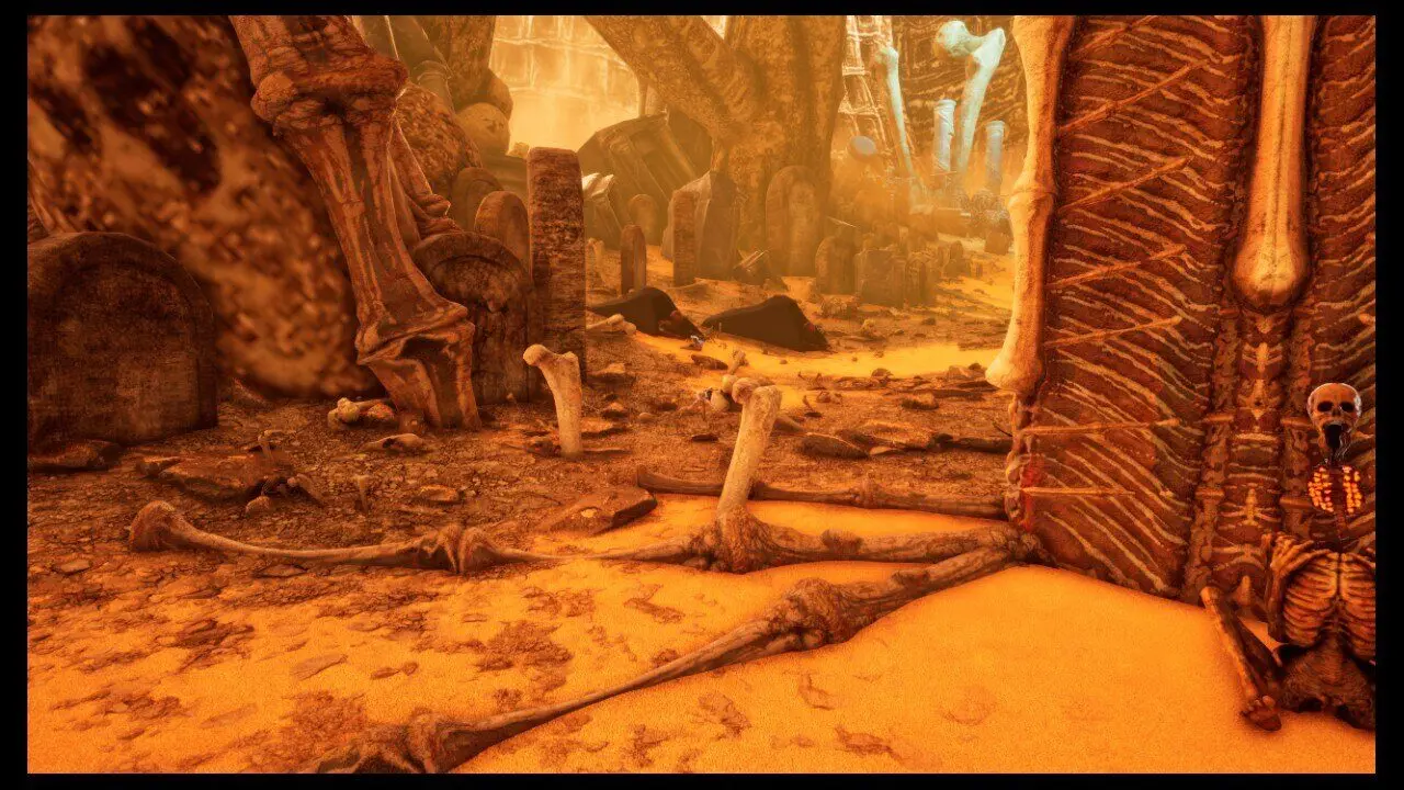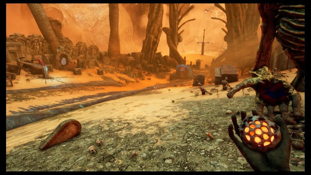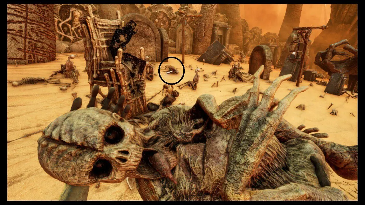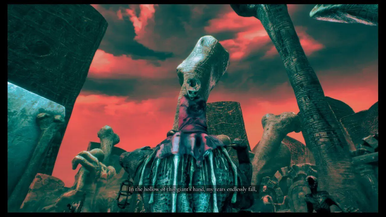 Volte até a criatura com a mão estendida e coloque o verme na mão, você receberá uma esfera brilhante (1/3) em seguida. Coloque o coração também, recebendo uma segunda esfera brilhante (2/3) em seguida. Por último, coloque o feto que conseguimos inicialmente e receba a terceira esfera brilhante (3/3). Deixe essa criatura de lado e siga até o rosto que mencionei parecer bloquear uma passagem, ele está à esquerda/frente da atual criatura. A esquerda desse local, está a Skull (3/5).