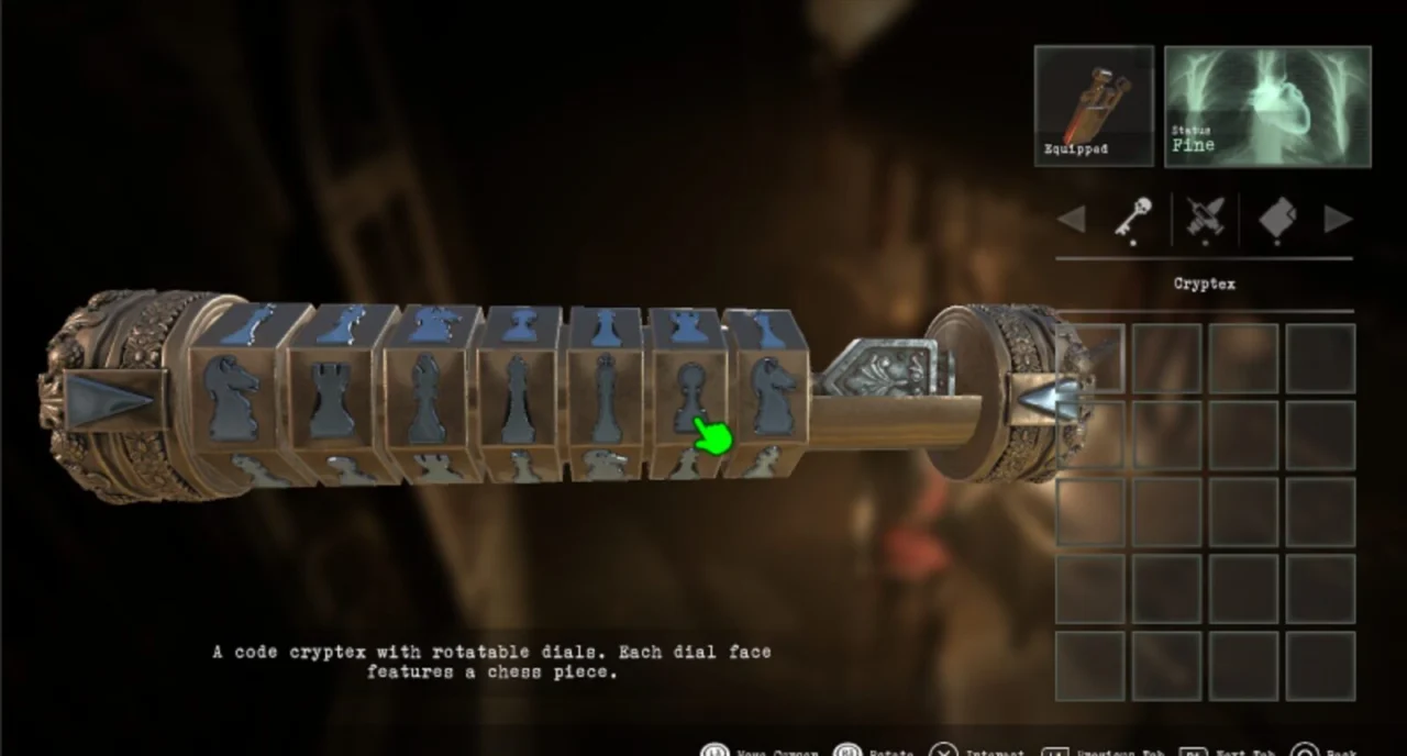 Imediatamente após conseguir o Criptex, abra seu inventário e examine-o, você terá de inserir a sequência correta para conseguir abrir, a pista para isso está no Tabuleiro de xadrez que você coletou anteriormente, mas como estamos aqui para facilitar sua vida, eis a sequência correta: