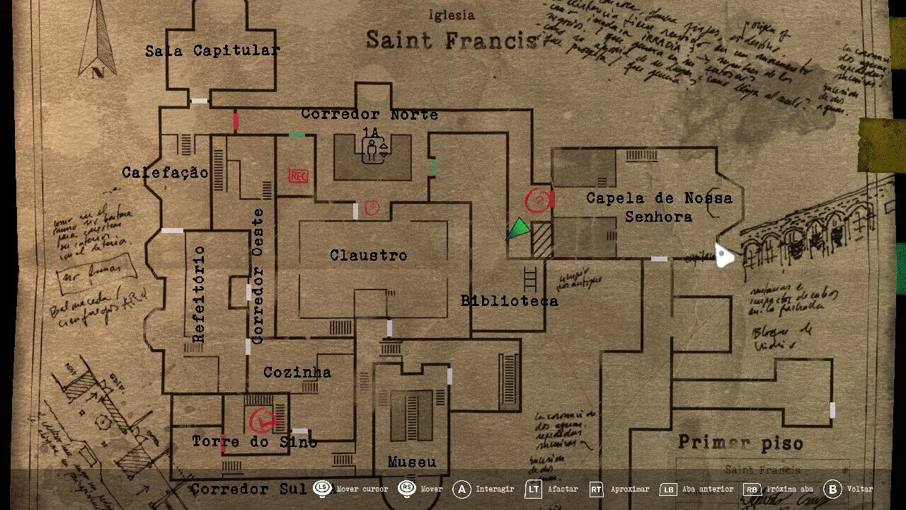 Logo que entrar, vire à direita e antes de descer a escada, verifique a escrivaninha para encontrar um telefone, verifique isso e tenha o local em mente, você voltará aqui em breve para resolver esse enigma. Desça a escada e continue pelo lado direito da varanda, verifique o portão nas grades para saber que ele está fechado, volte e siga pelo lado oposto e desça a escada vertical. Colete o Mapa do Convento sobre a mesa.