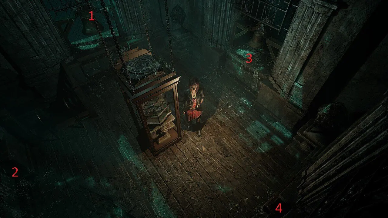 Comece a subir as escadas, quebre os vasos no caminho e no final das escadas, colete o Cartucho de escopeta. Suba a escada vertical para chegar na torre do sino de fato. Em uma caixa central está a Escopeta, para conseguir coletar a arma, você terá de usar o martelo para bater nos quatro sinos da sala na ordem correta. A sequência correta é: