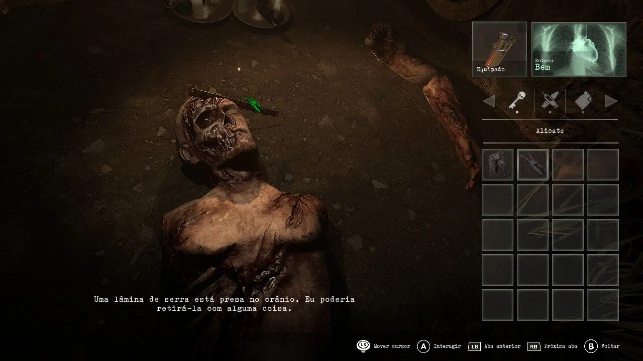 No baú do lado oposto, colete o Alicate. Verifique a mesa central para encontrar o Gravador, coloque uma das Fitas de Gravação que acabou de coletar e pressione botão verde no aparelho para iniciar a gravação do seu progresso.