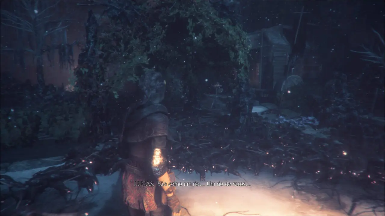 Avance e uma cena acontecerá. Os ratos vão se organizar de uma maneira diferente aqui, eles começarão a girar formando um amontoado. Esses aglomerados de ratos conseguem se mover e acabar com chamas e tochas. Eles vão se mover em nossa direção, use o ignifer para acabar com eles por três vezes. Após isso, Lucas nos dará a tocha e devermos seguir. Caminhe em frente até o corpo de seu pai, ele não está mais lá. Volte e entre na passagem lateral, recolhendo os itens no caminho.