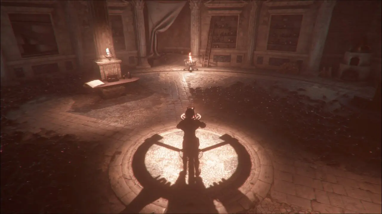 Siga para a nova sala pegando mais itens aqui, no lado oposto da sala há outra pintura na parede que você pode examinar. Há também 4 esculturas de animais que Lucas informa ter significados alquímicos. O poço do outro lado da sala tem um fogo embaixo dele, e há luz subindo pelo chão formando um símbolo, Segundo Lucas, o símbolo está relacionado a uma das esculturas dos animais. Temos mais 2 poços, mas ambos estão cheios de ratos. Você tem que acender os fogos embaixo de cada poço para a luz limpar os ratos e revele os símbolos.
