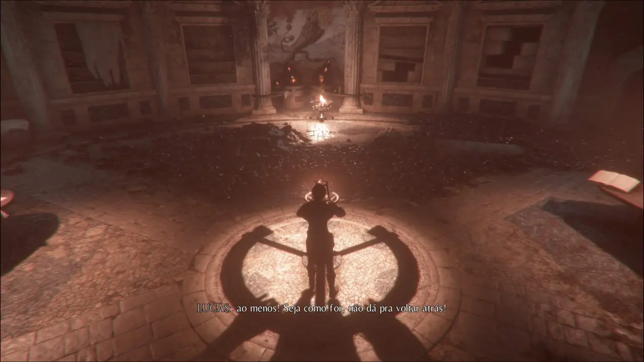 Teremos de resolver um puzzle. Desça pela piscina onde Lucas esta olhando e repare na passagem por baixo do piso, entre e encontrará um braseiro com um feixe de madeira, pegue uma delas. Essa área é circular, com braseiros abaixo das piscinas acima. Seguiremos o caminho circular, usando as madeiras em chamas para afugentar os ratos, e acender os outros dois braseiros. Há becos aqui e Lucas dirá que não pode mais te ver se você seguir por um caminho sem saída, se isso acontecer, volte.