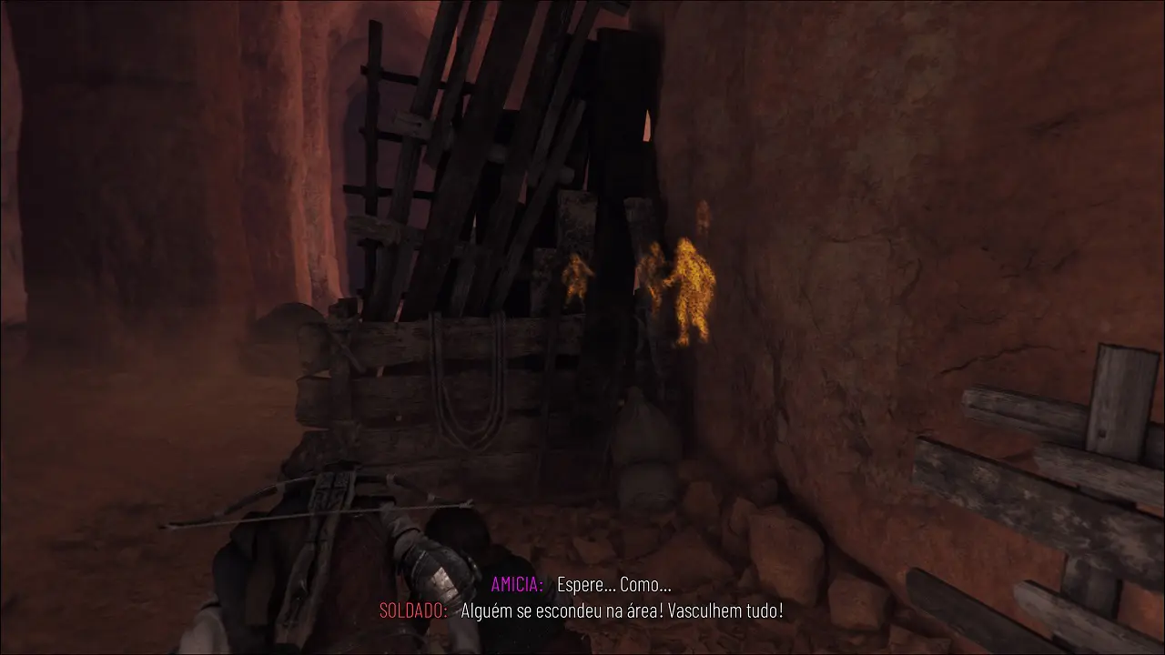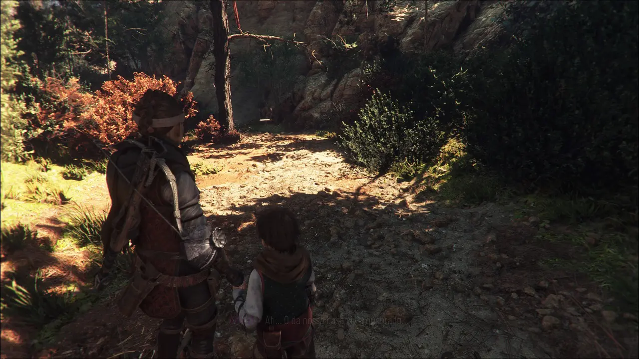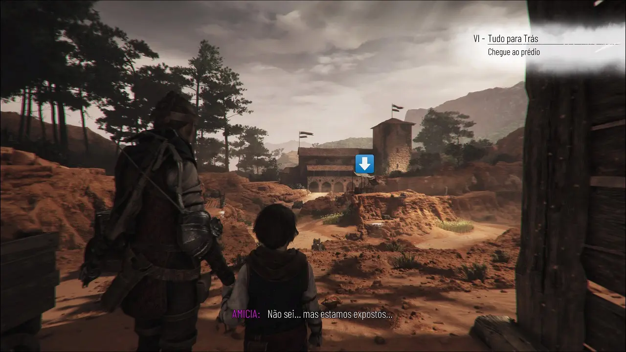 Estamos do lado de fora, Amicia mostra sinais de exaustão, mas devemos seguir em frente. Note a barraca bem no centro no local, temos de coletar um item de extrema importância que está lá. Siga a direita e se esconda na vegetação, pois os guardas vão aparecer, quando o guarda que vem da esquerda estiver voltando, suba a plataforma a frente e recolha os itens que puder, se esconda atrás das pedras. Quando estiver longe da vista desse guarda e do que está patrulhando o penhasco abaixo, desça e rasteje para a vegetação ao lado desse último guarda. Note outro guarda que esta na parte mais elevada, sincronize o guarda que está ao seu lado com este mais ao alto, e siga em frente passando entre as rochas, contornando a elevação a qual devemos subir, se esconda na vegetação. Temos outro guarda patrulhando aqui, outro mais distante e um terceiro atrás de nós, apenas se preocupe com o que está mais próximo, quando ele passar por você, ficando à direita da elevação, suba a plataforma e siga abaixado para trás da rocha na parte mais alta. Finalmente chegamos no baú com a Ferramenta, dentre outros itens.