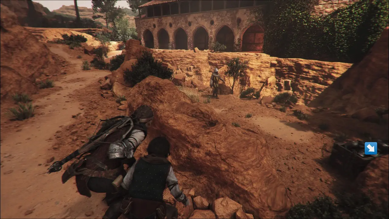 Atente-se ao guarda na colina mais elevada, quando esse e o guarda abaixo estiverem de costas, pule pela plataforma de madeira e se esconda na vegetação. Quando puder, pule a rocha logo a frente e pegue o Virote, que está preso nas madeiras, suba a plataforma logo ao lado e se esconda nas rochas quando o guarda voltar a patrulhar. Siga subindo a colina e quando o guarda não estiver olhando, elimine ele furtivamente, abra p Baú para pegar alguns itens e note o guarda patrulhando abaixo. Siga pela encosta e quando ele estiver de costas e se esconda na atrás da rocha. Quando ele voltar para a direita, siga em frente e desça a plataforma logo a frente, corra e se esconda na vegetação. Espere ele voltar para a esquerda e corra para o beco, abra ao baú e colete mais alguns bons itens, quando puder, volte para a vegetação, espere o guarda que patrulha a bifurcação passar, e este ao seu lado estar de costas e corra para a construção a direita, abrindo a porta e finalizando mais uma seção.