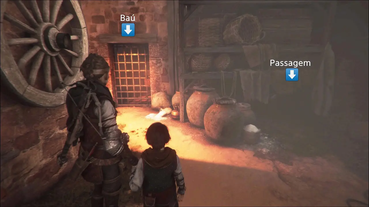 Caso não tenha percebido, havia um baú secreto antes de entrarmos no prédio, pois bem, vamos até ele agora. Note a prateleira à direita do portão de ferro, passe abaixado e estaremos diante de um Baú Secreto, recolha o que puder e não gaste nada em melhorias. Ignore a porta ao lado, volte ao corredor e siga em frente, passando pela porta. Amicia irá desmaiar, Hugo entrará em pânico, ganhando o controle absoluto sobre os ratos.
