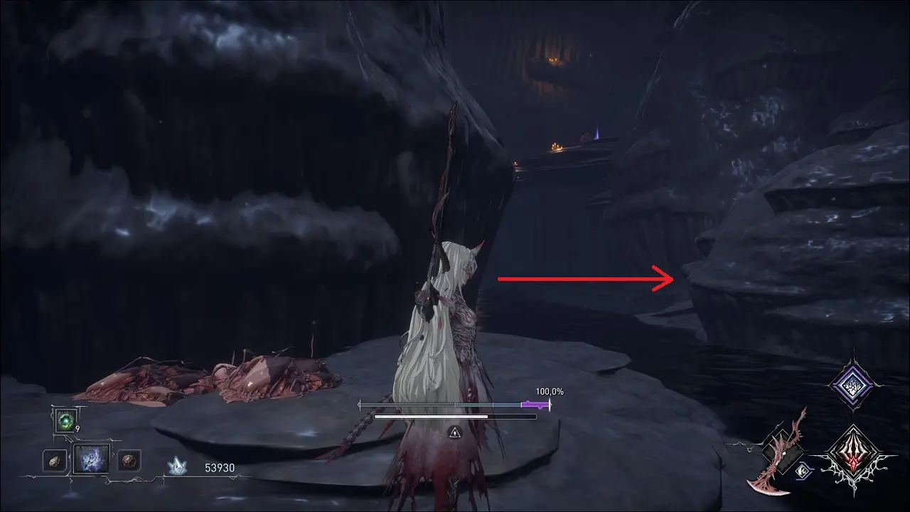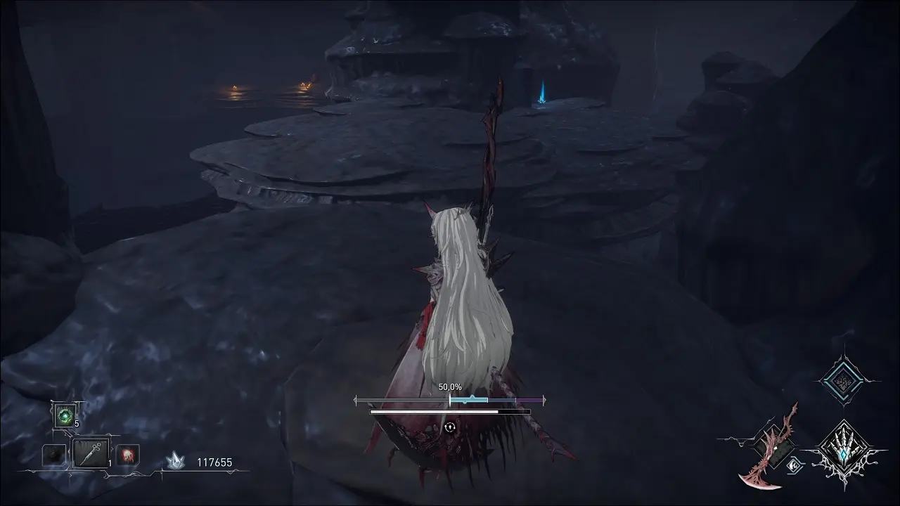 Saindo do elevador, vire à direita na ponte de pedra e siga até o final para encontrar uma Ressonância Contemporânea, cuidado com o inimigo distante que começará a atacar. Volte e colete o Núcleo da Levitação, siga pela colina à direita desse item, continue pela borda derrotando o inimigo e tomando cuidado com outro que estará atacando, ignore a ponte a direita e siga até o final para encontrar uma Sílica Luminosa. Volte e siga pela ponte de pedra à esquerda em direção ao inimigo, salte a lacuna e finalmente, derrote essa chata, coletando o Cubo de Nutrição na borda do precipício.