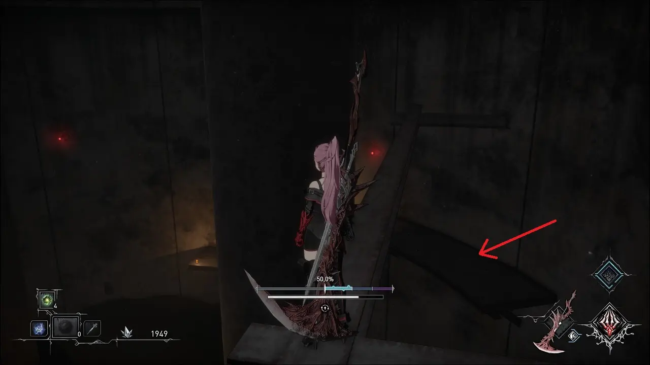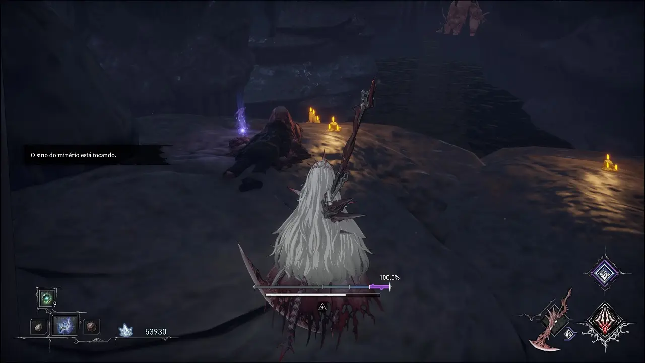 Volte para a sala à esquerda com o necro, mas essa vez, suba a escada vertical e colete a Sílica Luminosa e a Quitina Lascada. Note Stone pendurado na viga de ferro a sua esquerda, siga sobre a viga e converse com ele, esgote o diálogo e ajude ele a descer, converse com ele novamente e ACEITE para prosseguir com a linha de Missões Paralelas dele, após aceitar a ajuda, enfrentaremos um chefe de fase.
