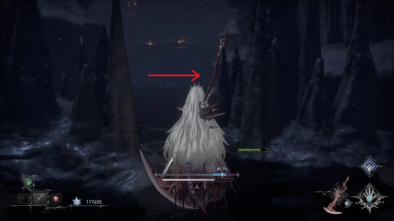 Partindo desse local, siga no sentido anti-horário ao redor do pântano e siga a próxima encosta à direita para chegar a uma saliência, suba até a colina com vista para o pântano, onde você encontrará um inimigo e o Mapa do Comerciante. Ainda na colina, note a passagem à esquerda, escondida entre as rochas, siga por ali, você encontrará um guardião no final dessa caverna. Cuidado ao enfrentar esse inimigo, ele é poderoso, quando morrer, deixará um Fragmento Adaptável, Ressonância Contemporânea, Diamante Luminoso e 4200 Cristais, elimine o resto dos inimigos também. Colete a Eucaristia e tome o elevador