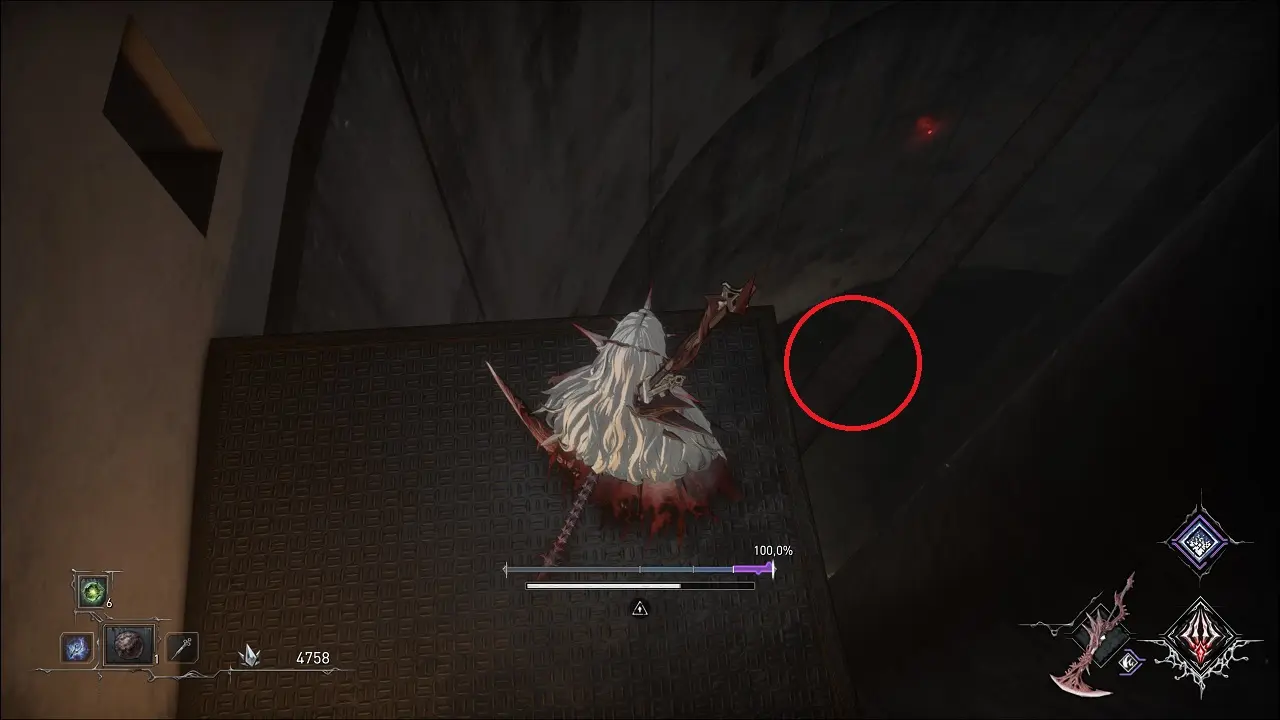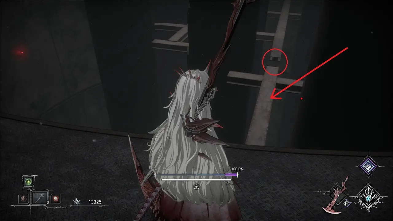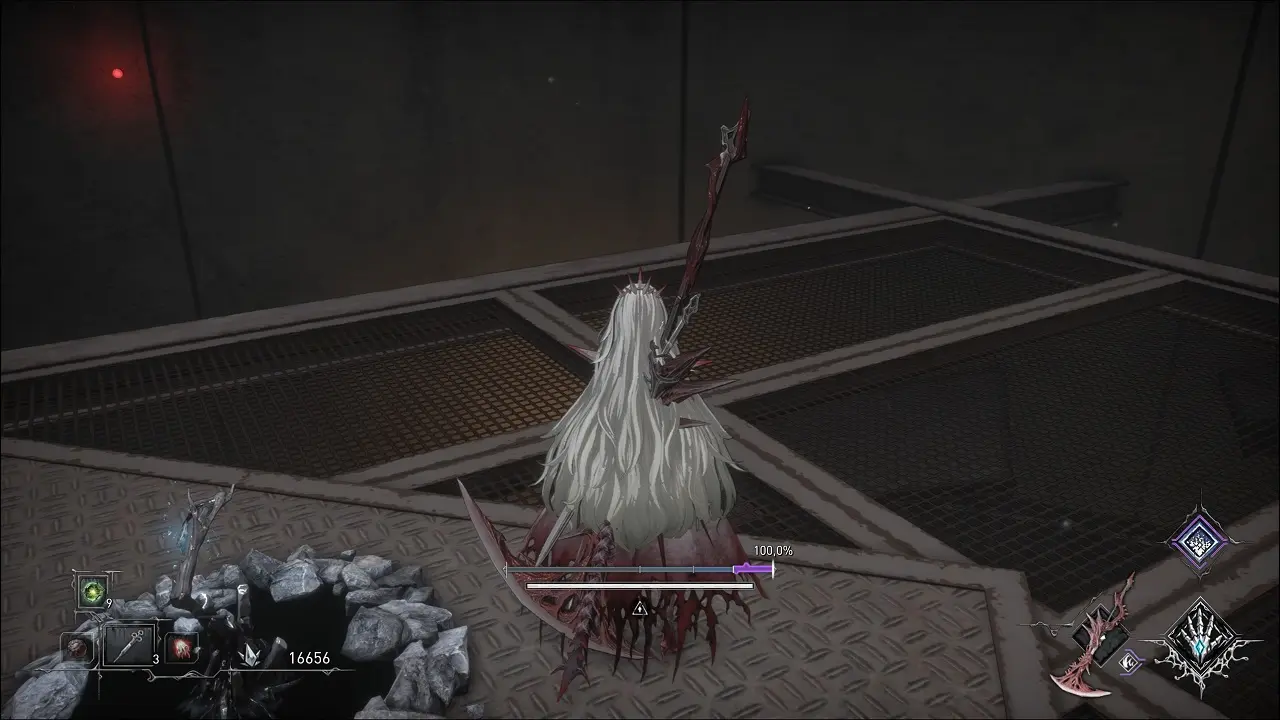 Após a batalha, colete a Pedra sobre a viga e volte até o elevador, saia pela porta e caia na viga mais a direita na plataforma. Siga em frente nessa plataforma e vire à esquerda, continue até o final, ignorando a passagem à direita. Deixe seu PV completo antes de correr e saltar para a plataforma abaixo, você deve sobreviver apenas com im fiapo de vida. Colete a Ressonância Contemporânea do lado direito e siga para o lado oposto, deixe seu PV cheio novamente, pois você deverá cair na plataforma abaixo novamente, levando um dano massivo após a queda.