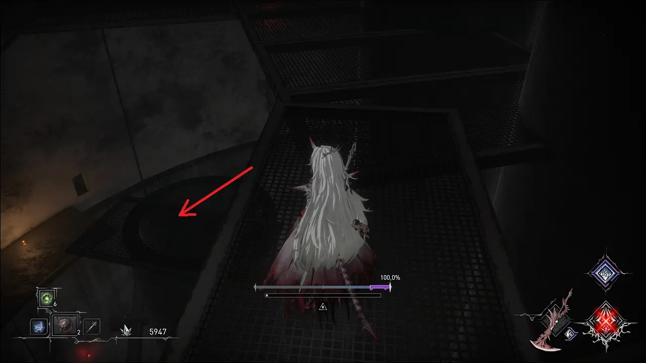 Assim que sair do elevador, ligue o Ramo: Eixo Subterrâneo. Note plataforma onde você pode descer e seguir pela plataforma. Perceba a viga de ferro à esquerda mais abaixo, desça e corra através dela, saltando a lacuna para atravessar para o outro lado, procure a esquerda por um cano quebrado para encontrar um Aglormerado Cristalizado dentro.