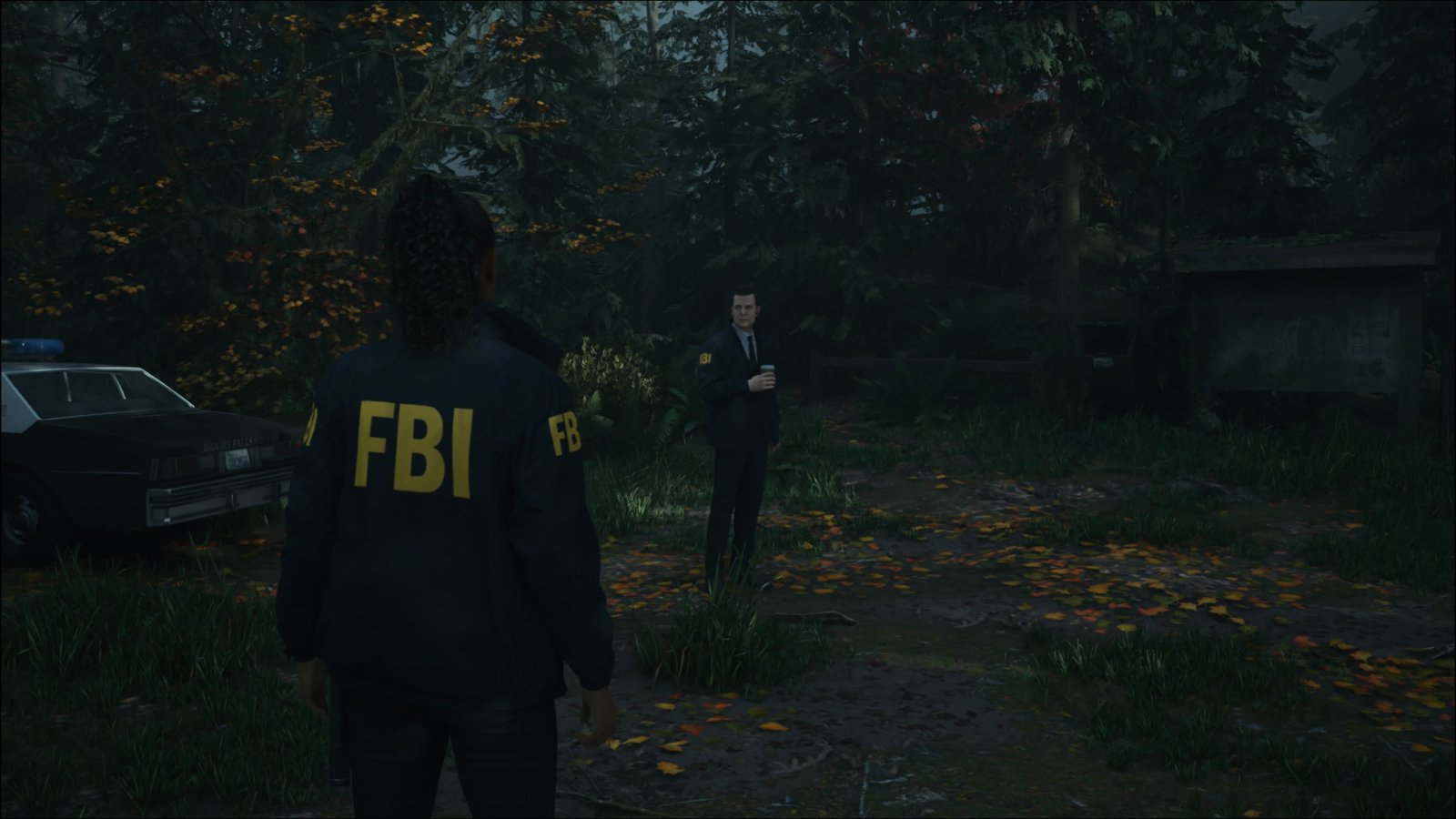 Você pode abrir o mapa pressionando o lado esquerdo do . O Casey seguirá para a esquerda, então o acompanhe ao longo do caminho até encontrar outro policial, chamado Mulligan. Durante a conversa, repare que podemos escolher entre mais de uma resposta, caso queira saber mais informações. Saiba que isso não irá interferir em quaisquer troféus, você pode responder como quiser. Quando terminar, siga pela passagem na cerca e desça a colina. O jogo irá ensinar a acessar o Lugar Mental, pressionando o lado direito do