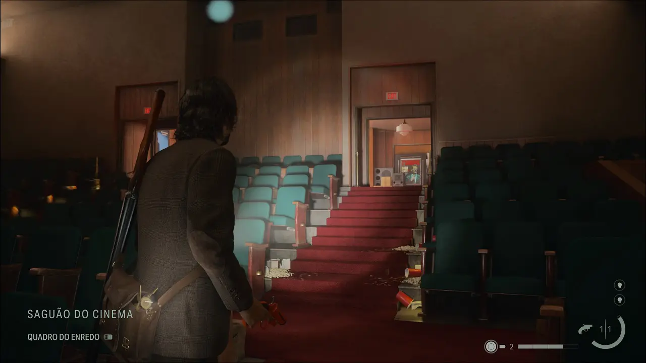 Suba a escada logo ao lado dessa entrada, dê a volta e olhe em direção ao Lava Rápido. Encontrará um Eco aqui. Feito tudo isso, poderá seguir para o cinema. Coloque o ticket na cabine e siga pela porta ao lado. Assim que entrar, verá um Eco, mas não poderemos acioná-lo ainda.
