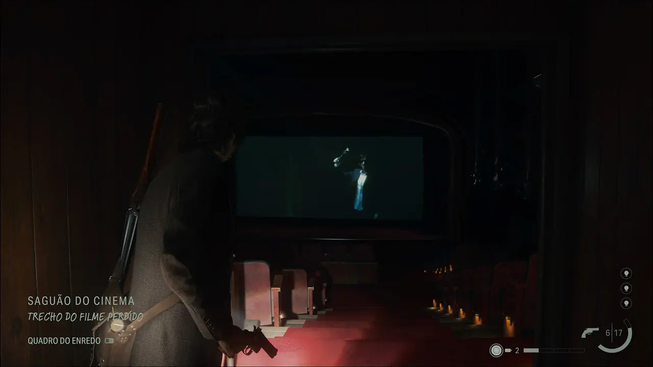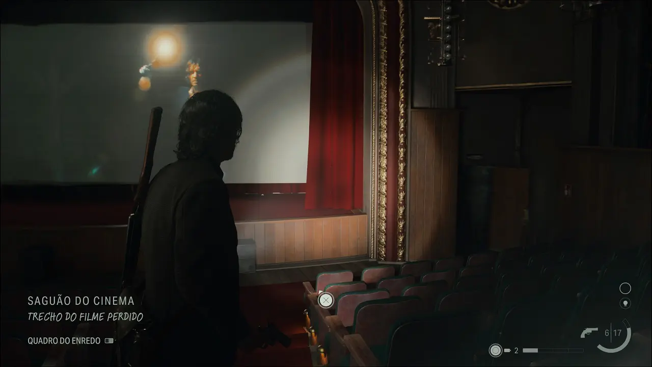 Volte para a sala onde estávamos há pouco e entre novamente na Sala do Escritor. Abra o Quadro de Enredo e altere o cenário Saguão do Cinema para A Nata de Nova York. Tudo mudará novamente, e agora a sala de cinema estará intimidadoramente avermelhada. Entre na porta à esquerda e suba para chegar em uma caixa com itens e uma porta que não podemos abrir. Verifique as insígnias policiais no chão. Volte pelas escadas e entre na Sala do Escritor. Abra o Quadro de Enredo e altere o cenário Saguão do Cinema para Trecho do Filme Perdido. A realidade mudará, e estará passando um filme do Casey. Lembra que comentei sobre a quantidade de luzes que você deveria ter? Caso tenha ao menos 2 luzes, deixe uma delas aqui nesta sala, criando uma Sala Segura, e coloque a outra luz na tela congelada na imagem de Alan Wake. Caso só tenha uma luz, coloque na tela. De qualquer forma, irá abrir uma porta à esquerda, que leva para fora do cinema.