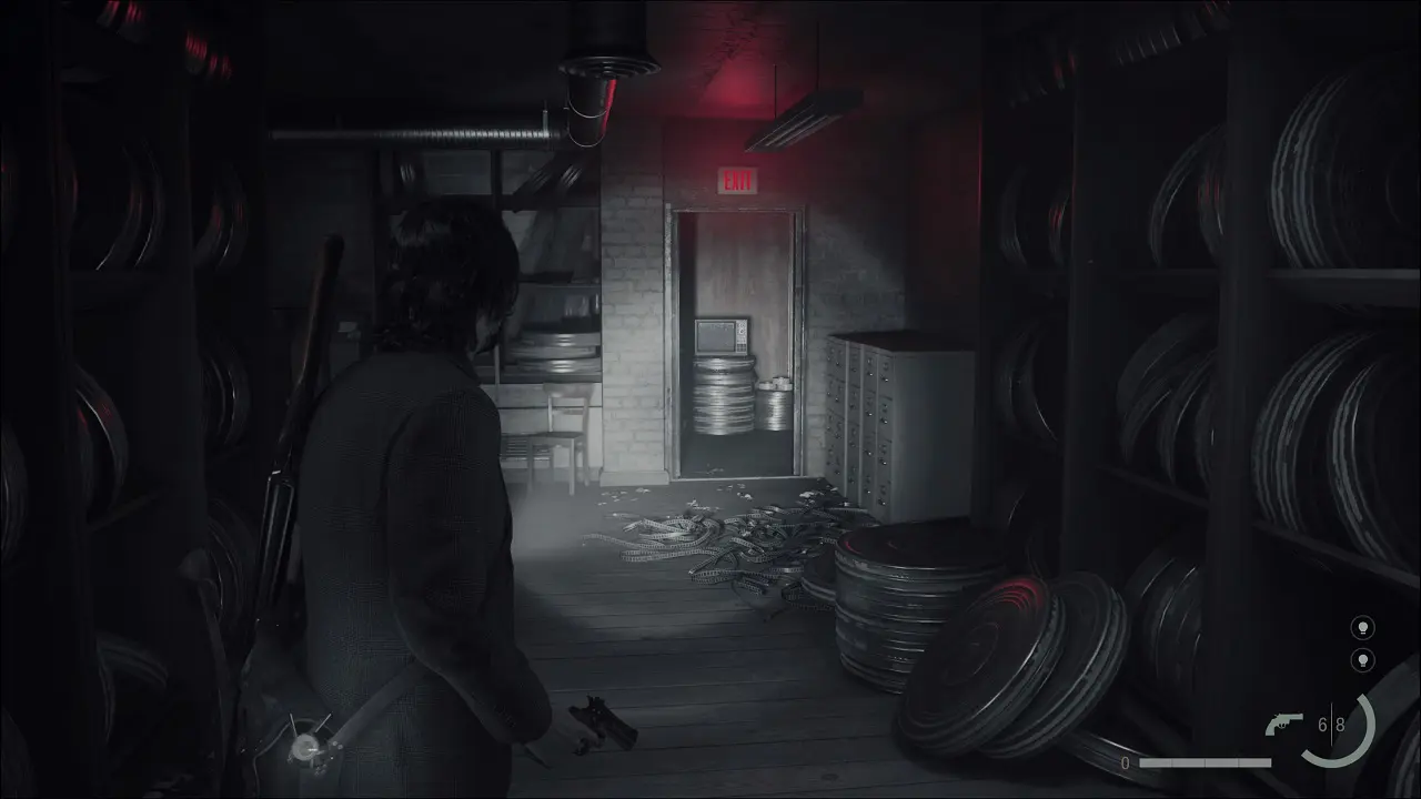 Descendo a escada, estaremos novamente diante da viatura, mas note que agora há várias Sombras Hostis aqui. Durante a batalha, poderá se abrigar na Sala Segura que está mais ao fundo. Quando estiver pronto, absorva a luz da viatura. Use a escada atrás da viatura para voltar ao cinema. Volte até a seção onde está a imagem de Alan Wake e entre na Sala do Escritor. Vá ao Quadro de Enredo e altere o cenário do Saguão do Cinema para O Grão-Mestre. A realidade irá mudar, e uma porta aparecerá na tela. Entre por ela, e chegará a uma situação semelhante a uma Justaposição. Não haverá inimigos, mas ouvirá vários sons e ruídos. Siga pela porta a frente e atravesse a sala com vários filmes, chegando em outra sala. Passe por ela, saindo pela porta escrito Exit à direita. Passe por ela e pela próxima porta à frente. Casey estará nessa nova sala. Siga em frente, passe novamente pela sala de projeção, e quando Casey voltar a falar, fique atento. Siga em frente, e quando chegar diante da porta, não entre. Siga para a esquerda e note uma porta escrito Exit. Tome a imagem abaixo como referência. Repare no armário ao lado da porta para obter o Vídeo da Jornada do escritor 8/8.