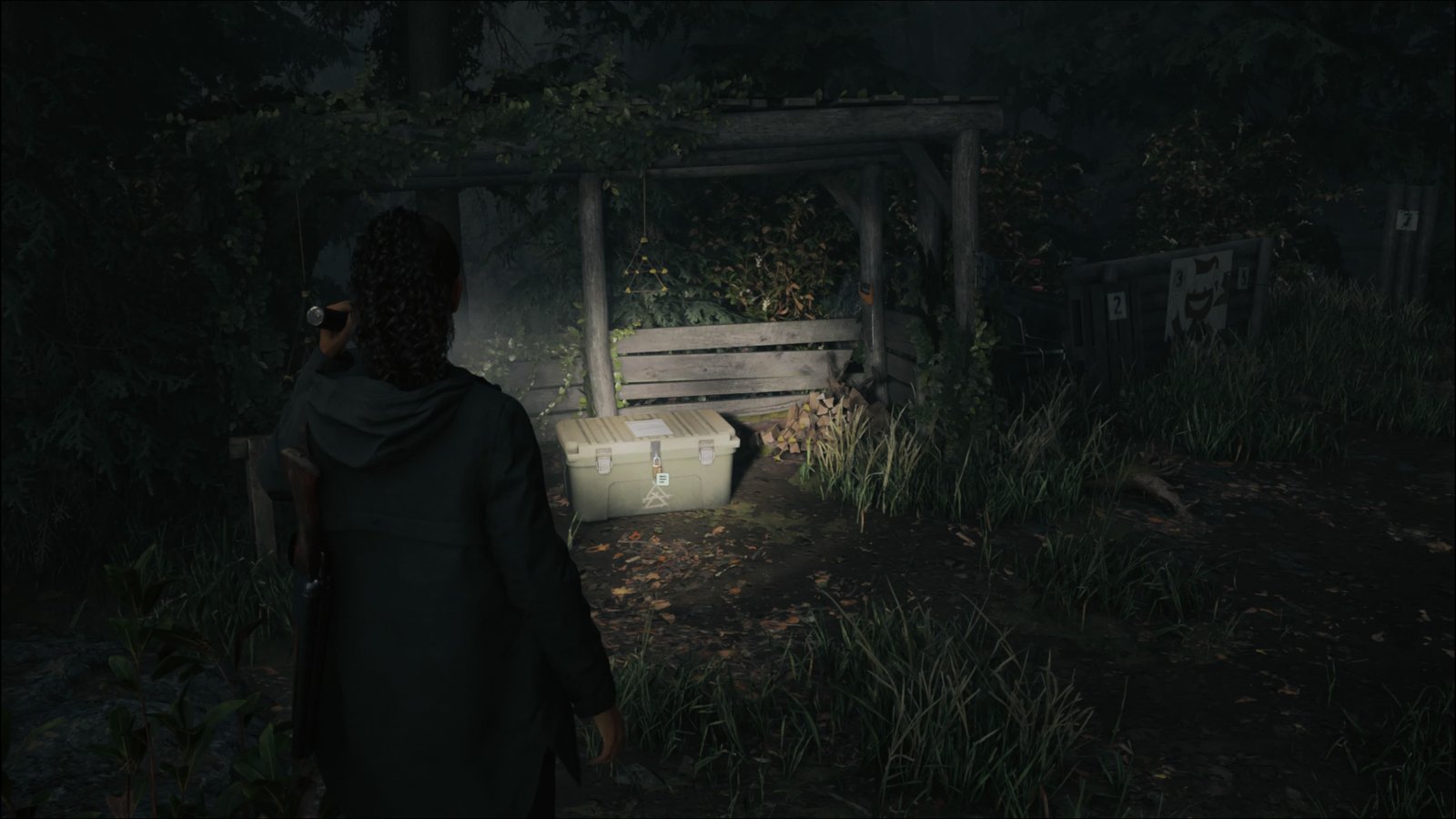 Volte até a bifurcação onde ignoramos o inimigo há pouco, e desta vez vamos para oeste, de encontro a ele. Elimine o Possuído e continue descendo pela trilha até chegar em uma ponte. Há uma bifurcação logo em frente. Siga pelo caminho da direita até chegar a um pequeno acampamento com uma caixa térmica em cima da mesa. Ao lado da barraca, encontrará a Lancheira de Alex Casey (Watery 2/6). Abra a lancheira para obter 5 Fragmentos de Manuscrito.