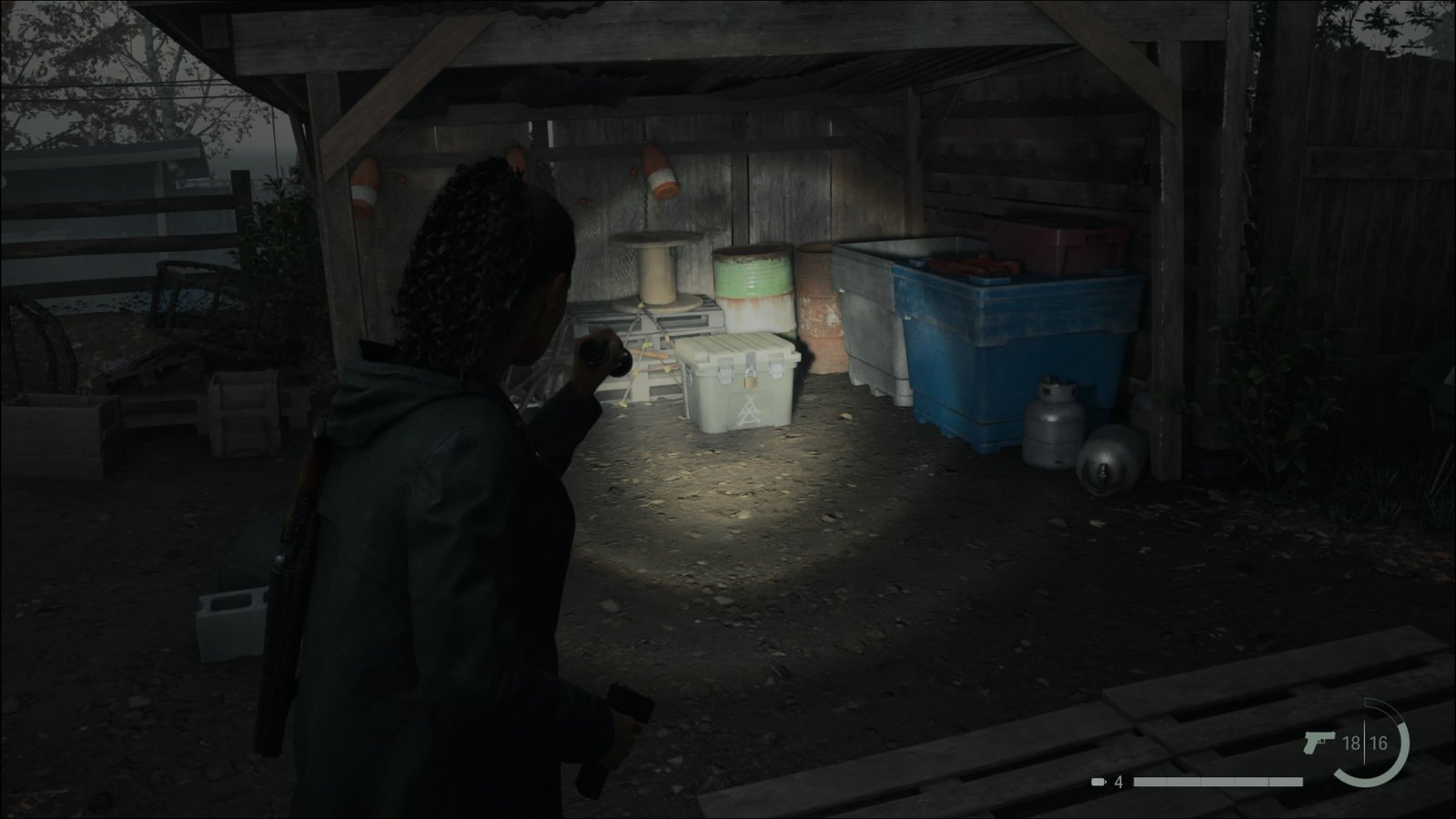 Já exploramos as áreas novas, mas ainda há mais itens a serem coletados. Saindo do chalé, haverá um Possuído lhe esperando. Se voltar pela estrada para o leste, até aquela Sala Segura que fica ao sul da Torre de Rádio, poderá seguir para o leste até aquela caixa de emergência no poste, que estava trancada com um cadeado. Arrombe o cadeado com a Chave de Fenda e pegue o conteúdo. Depois pegue o caminho ao sul até voltar para a cidade. Não vamos embora da cidade ainda. Comece voltando para a Sauna, e siga para o cais que fica ao sul. Este local estava alagado antes, mas agora está acessível. Ao final do cais, pegue a Página do Manuscrito (Moça Local 12/14): A Presença Obscura Ataca. Agora vá até o cais que fica no canto sudeste da cidade. Atrás das caixas aqui, encontrará a Caixa da Seita (Watery 7/8). A senha do cadeado é 496. Abra a caixa e pegue Munição de Espingarda, Virote e um Curativo.