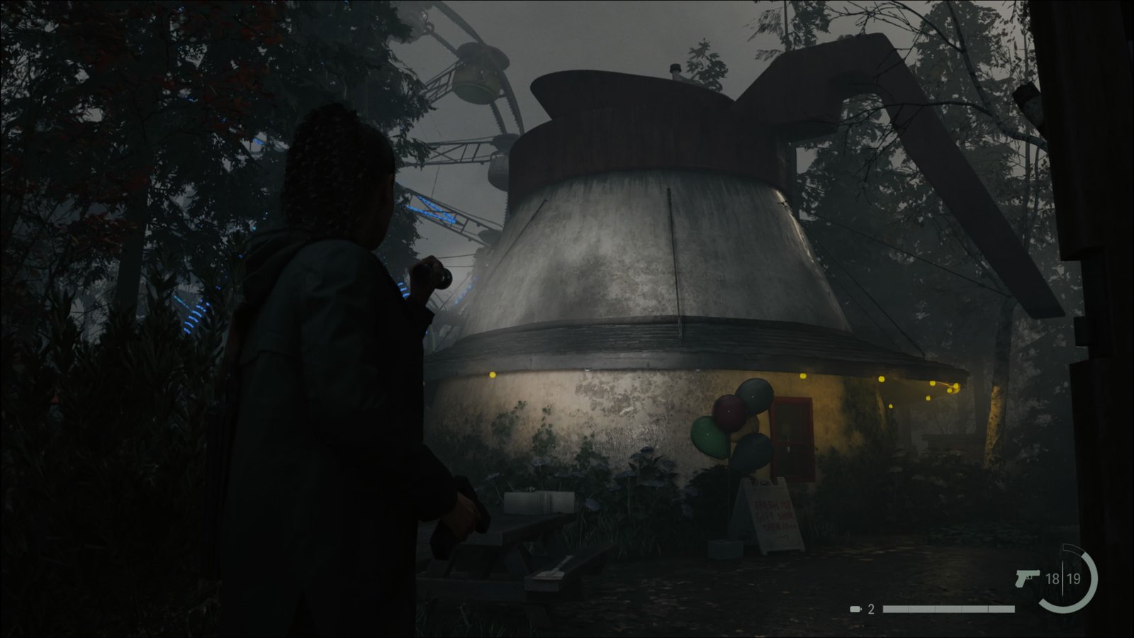 Volte para o gazebo iluminado. Siga para o leste e abra a caixa de emergência no poste para pegar mais um item. Siga para o norte, e verá um local com uma série de barracas, chamado Fair Trade Fun Zone. Procure nestas barracas por três caixas térmicas e Virotes para a sua Besta. Não se assuste com a placa falante no local. Depois siga para o sul, na direção de um brinquedo chamado Percolator. Respire fundo e entre no brinquedo. Assim que entrar, o brinquedo começará a girar, e não poderá sair. um Possuído jogará machados de cima da torre ao centro. Acabe com ele e tome cuidado com outro Possuído que virá em sua direção. Após eliminar ambos, o brinquedo irá parar, e o portão irá se abrir. Vá ao canto sudeste e pegue a Chave de Fenda que está sobre um painel. Ao pegar o item, irá liberar um troféu: