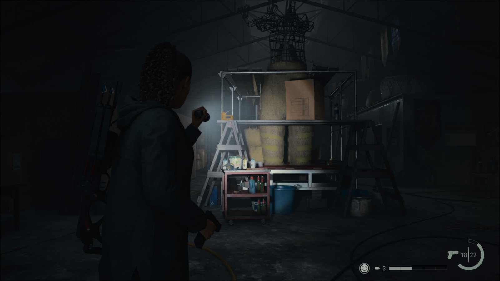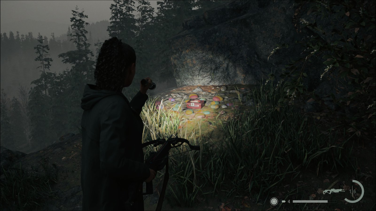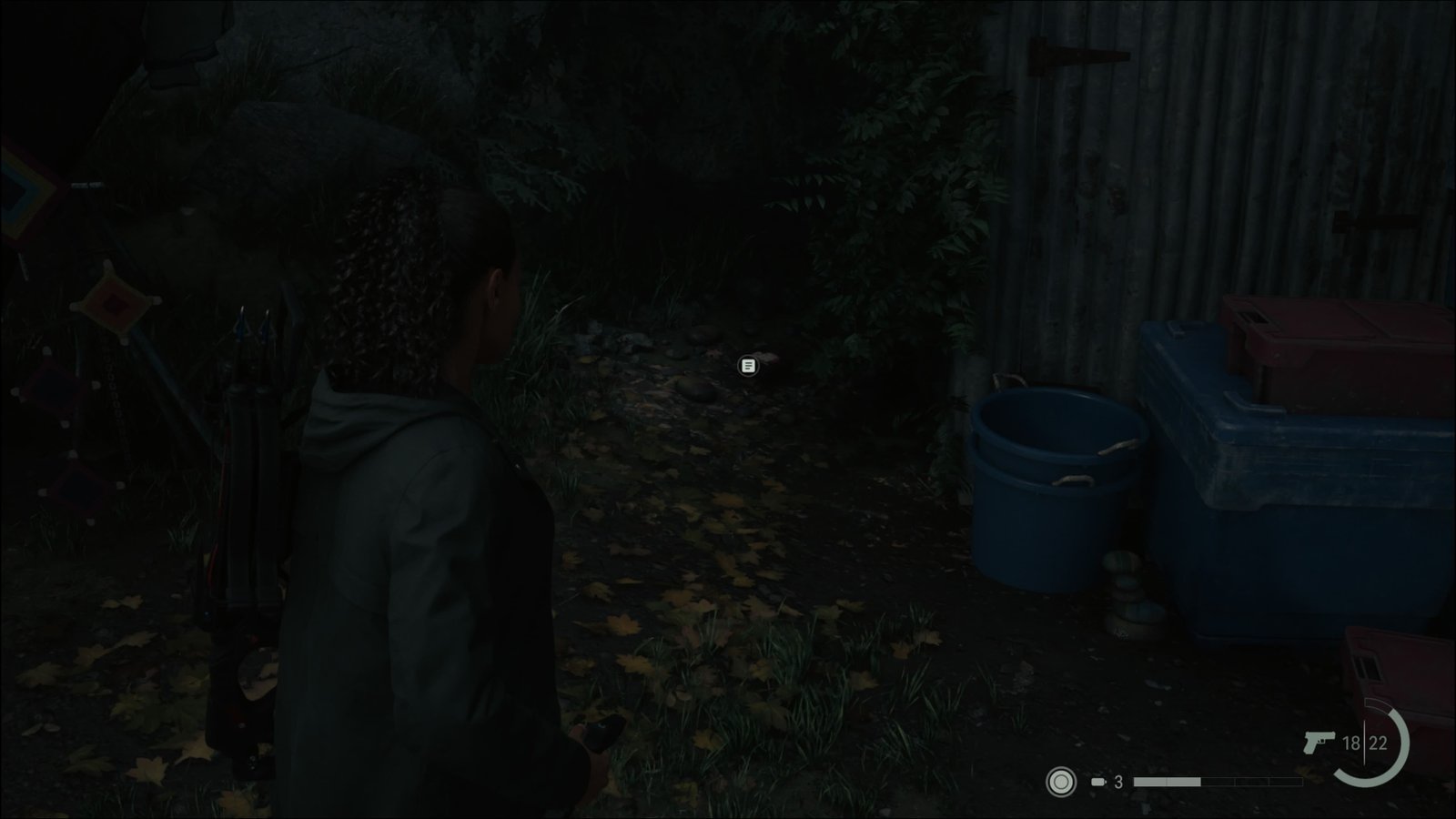 Esta arma ocupa três espaços no inventário, e usa Virotes como munição. Poderá pegar alguns Virotes ao lado. Volte até a estrada e siga para o norte. Quando chegar em uma bifurcação, note o inimigo a oeste. Ignore-o por enquanto e siga para o norte. Abra a caixa de emergência no poste para pegar um item. Suba até a Torre de Rádio, facilmente identificada no seu mapa. Passe pelo poste iluminado e vá para o sul. Abra a caixa térmica na mesa para pegar um item, e deverá ouvir o Programa de Pat Maine 5/9: Piada Estranha de Gil no rádio. Um pouco mais ao sul, encontrará mais desenhos e um poema de cantiga de roda. Esse quebra-cabeça é bem simples, basta colocar o Boneco de Cervo sobre o desenho da casa para completar o Quebra-Cabeça da Cantiga de Roda 5/17. Assim que resolver esse quebra-cabeça, se veio seguindo o guia até aqui, irá liberar o seguinte troféu: