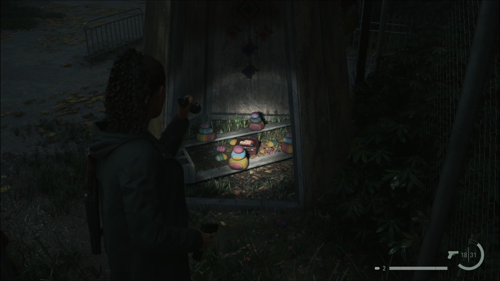 Agora até a Lojinha. Pode haver Possuídos perambulando pelo parque, então ande com cuidado e elimine todos os que encontrar. Chegando à Lojinha, entre e pegue a Faca Puukko de Brinquedo do outro lado, perto do balcão. Agora só falta um item. Siga para sudeste da loja e então leste, voltando até a área cheia de barracas, Fair Trade Fun Zone. Deverá haver 2 Possuídos aqui, então fique atento e acabe com eles. Vá até o boneco de papelão falante, o Sr. Pingo, e pegue a Fita Cassete atrás dele.