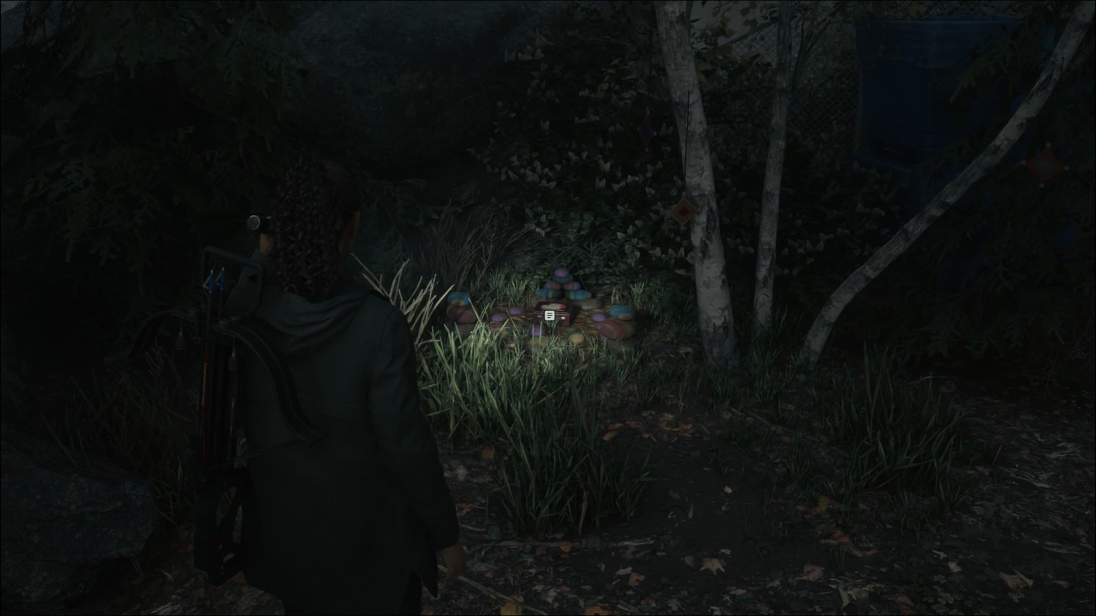 Agora volte até a bifurcação e siga para o leste, subindo a colina. Seguindo para o norte, verá uma placa de avisos. Bem à direita da placa, existe um caminho por baixo de uma árvore caída. Siga por esse caminho e suba na pedra. Pegue a Página do Manuscrito (Moça Local 2/14): Watery no chão. Ao final do caminho, irá encontrar a Caixa da Seita (Watery 1/8). O código para abrir o cadeado é uma sequência aleatória de botões bem simples, basta prestar atenção e repetir. Abra a caixa para conseguir Munição de Espingarda e um Tanque de Propano.