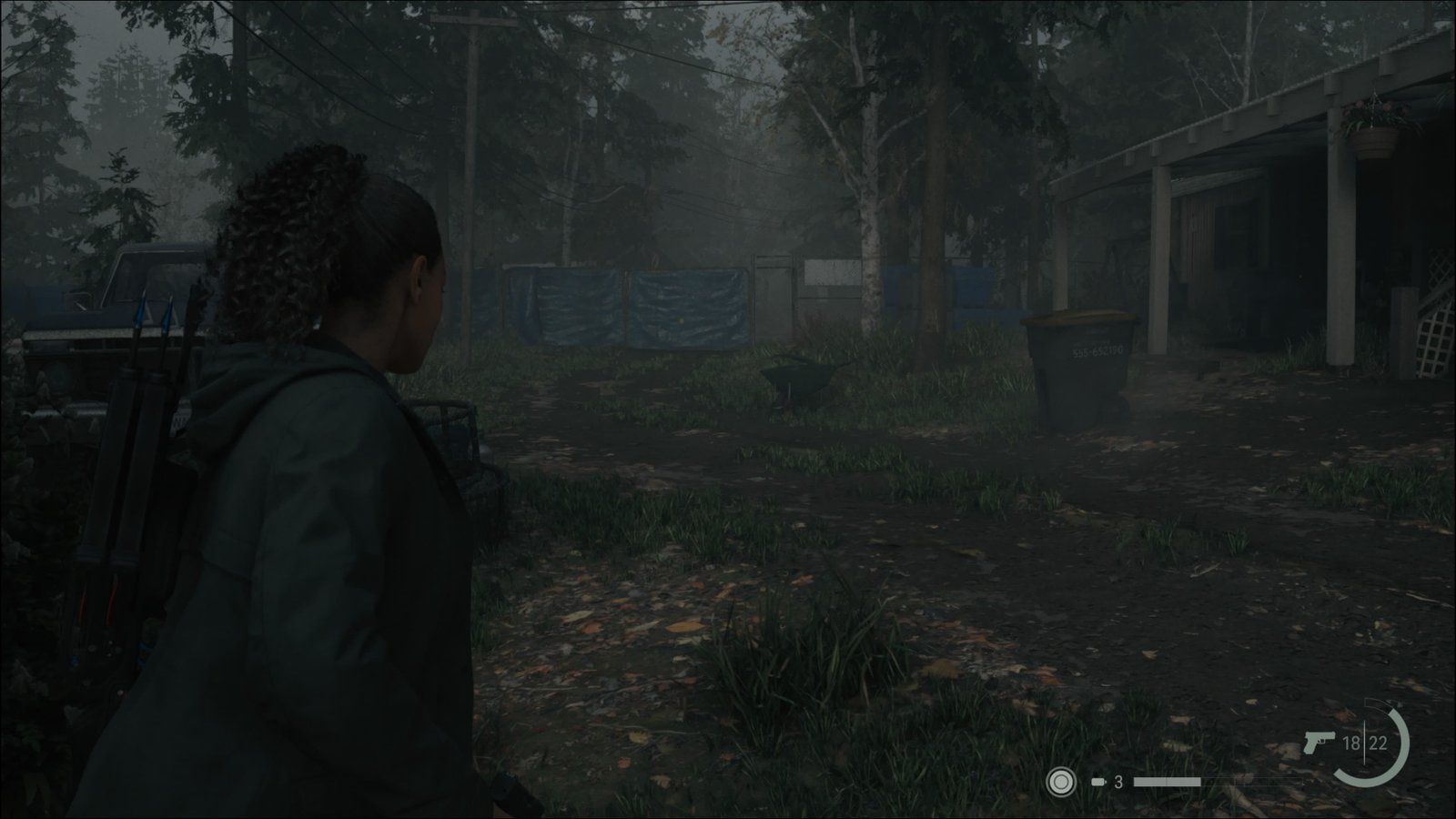 Após a mensagem de fim do capítulo, estaremos novamente no controle, diante do poço. Conseguimos o Clique. Podemos voltar ao carro e ir embora, mas novas áreas estão disponíveis, então vamos explorá-las. Temos muita coisa para coletar antes de efetivamente terminarmos o capítulo. Abra o seu mapa e siga para o Estacionamento de Trailers Lighthouse, na ponta sudoeste do mapa. Chegando ao local, siga para a parte sul, que estava anteriormente alagada. No lado leste, há um portão trancado com cadeado, e não poderemos abri-lo ainda. Siga para oeste, e encontrará a Caixa da Seita (Watery 5/8) na frente de outro trailer. A caixa está trancada com cadeado. Entre no trailer ao lado, arrombando a fechadura com a Chave de Fenda. Logo na entrada, abra uma gaveta adiante para obter um item e siga para o quarto à esquerda. Verifique o computador para obter uma dica da localização da chave da caixa. Saindo do trailer, vá para oeste e suba na tábua de madeira. Pegue a Chave da Caixa do Estacionamento de Trailers em cima do painel de energia. Use-a para abrir a caixa e obter um Virote, um Curativo e um Tanque de Propano.