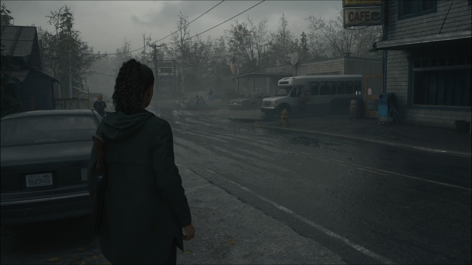 Neste momento, já deverá ter vários Fragmentos de Manuscritos. Recomendo que compre o upgrade Dois Tiros para a Besta, que permite disparar dois virotes sem precisar recarregar. Vá para o sul até voltar para a estrada principal, Main Street. Há diversas áreas aqui que podemos explorar agora, mas já iremos explorá-las futuramente na história principal, então vamos deixar para mais tarde. Vá para oeste, e logo verá uma bifurcação na estrada. Siga para o sul, e verá mais uma bifurcação. Vá para a direita, e verá uma cabana que funciona como uma Sala Segura. Entre, pegue um item no armário de arquivos, salve seu progresso e organize seu inventário. Logo aqui do lado, fica o Estacionamento de Trailers Lighthouse, então aproxime-se e abra o portão com a Chave do Estacionamento de Trailers para ver uma cena.