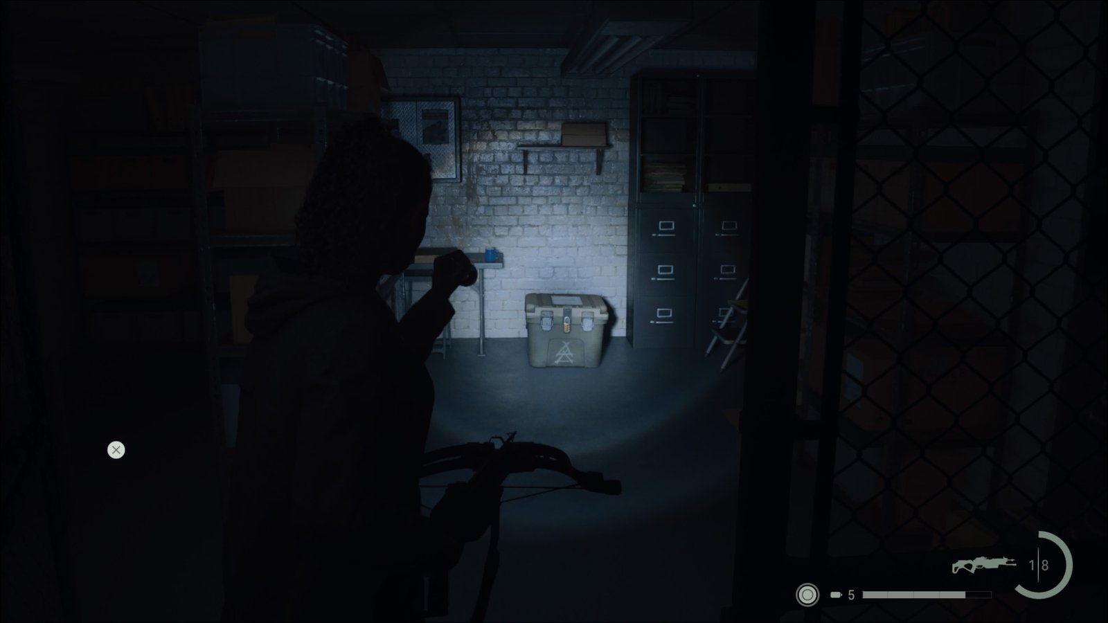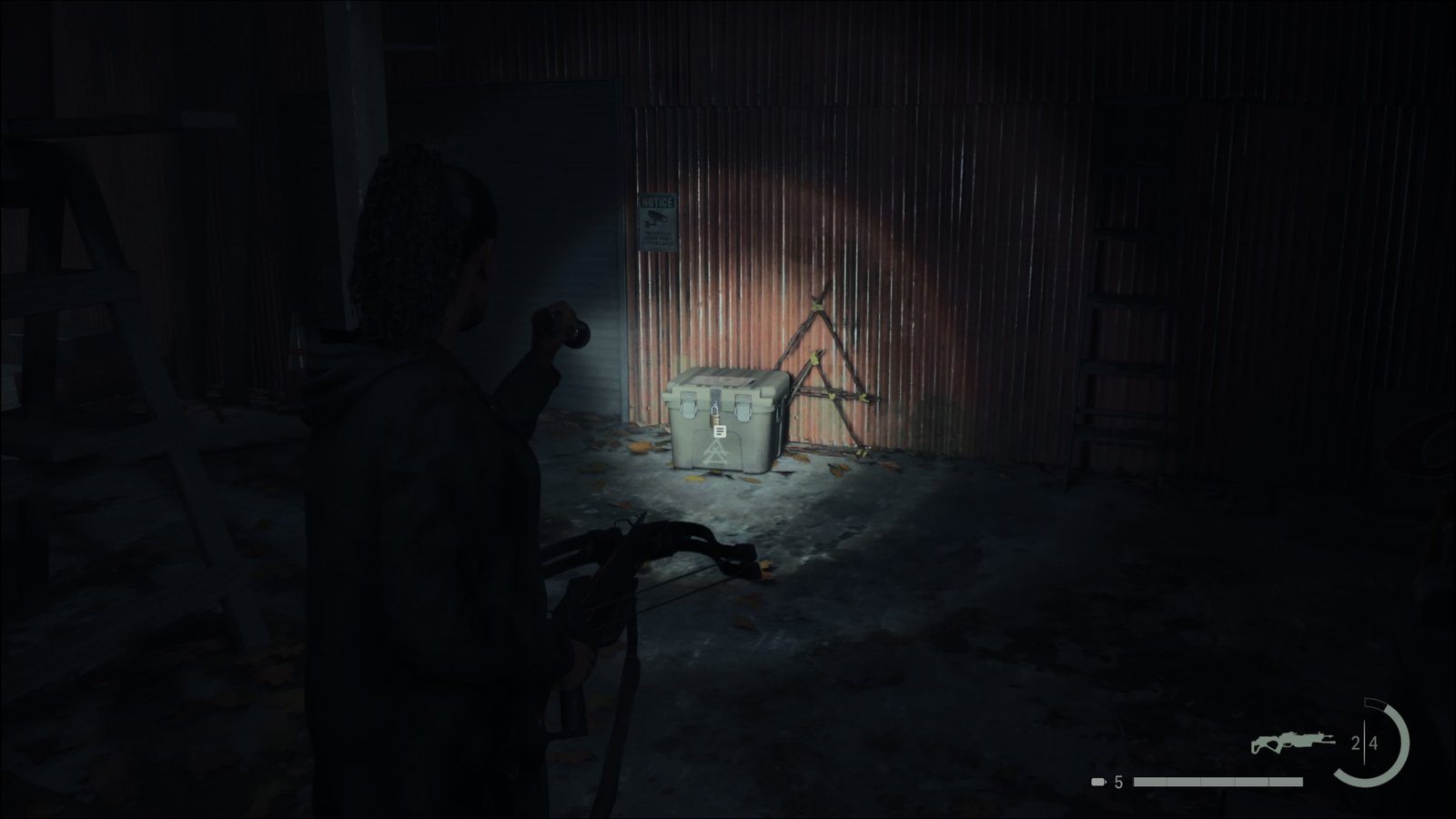 Essa arma é um pouco mais poderosa que a Espingarda de Cano Serrado e tem mais munição, então eu recomendo que a substitua. Saia da sala e inspecione a porta ao lado para obter uma Pista. Agora siga para o leste e vá até o final do corredor. Use a chave para abrir a porta e desça as escadas até o porão. Entre na porta à direita para acessar a Sala de Provas. Pegue os itens na gaveta do armário e use o Alicate para arrombar o portão. Nos fundos dessa sala, encontrará a Caixa da Seita (Bright Falls 9/9). A senha para abrir o cadeado dessa caixa é 146. Dentro da caixa, encontrará uma Granada de Atordoamento, um Foguete Sinalizador, Munição de Espingarda e Munição de Fuzil.