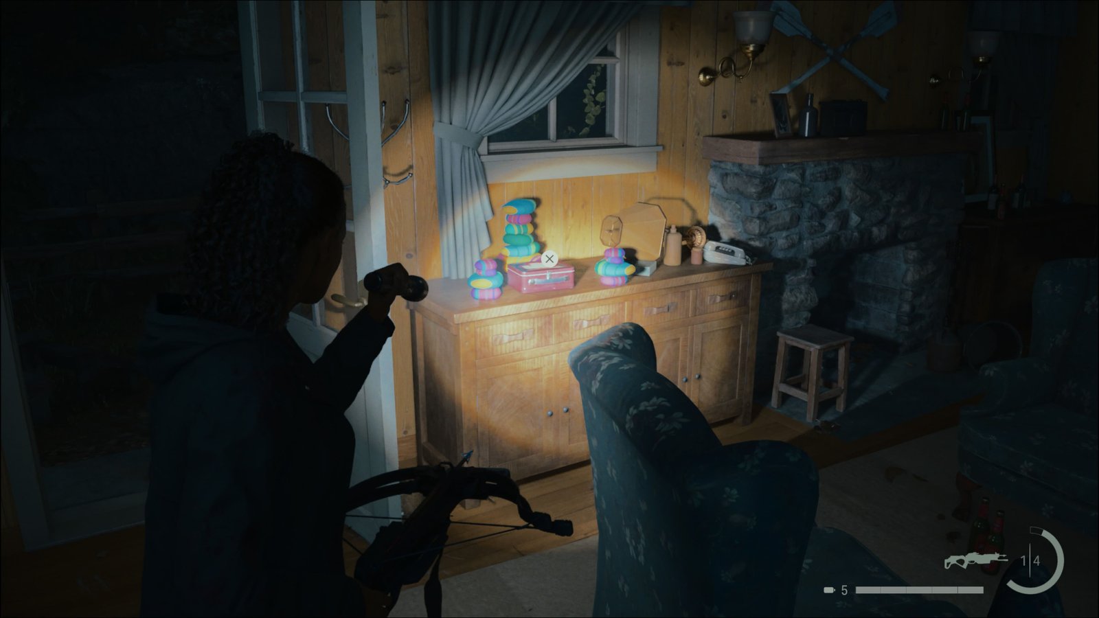 Saia do chalé e siga para o norte. No canto noroeste do local, verá um gazebo. Mais a nordeste deste gazebo, verá algumas árvores com um número escrito com tinta que aparece diante da luz da lanterna. Procure pela árvore com o número 2, que fica bem perto das pedras, e procure atrás dela para encontrar a Chave da Caixa dos Chalés. Agora volte, entre no chalé nº 5, saia pelos fundos, siga para o sul, passe por baixo da árvore e passe por dentro do chalé nº 3 para voltar ao início do local. Haverá um Infectado e um Possuído esperando do lado de fora. Mate-os, e então vá para o sul e entre no chalé nº 1 para encontrar uma Sala Segura. Pegue a Página do Manuscrito (O Coração 11/12): Cauldron Lake sobre a cômoda à direita. Entre no banheiro para encontrar a Caixa da Seita (Cauldron Lake 5/5). Use a chave que adquirimos para abrir a caixa. Dentro da caixa, encontrará Munição de Fuzil, uma Granada de Atordoamento e um Foguete Sinalizador.
