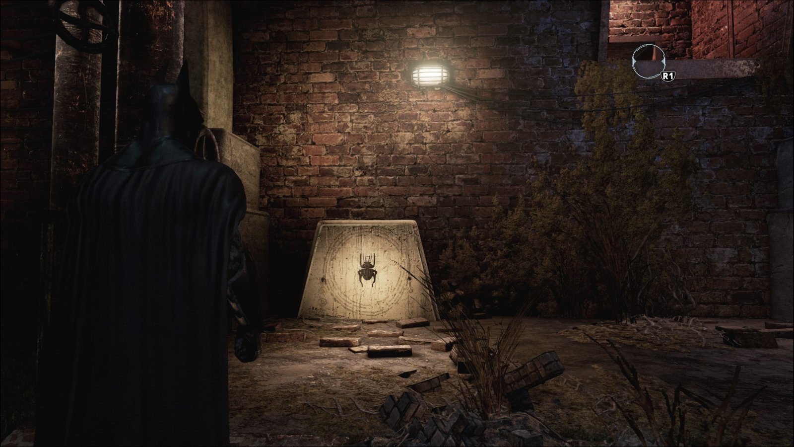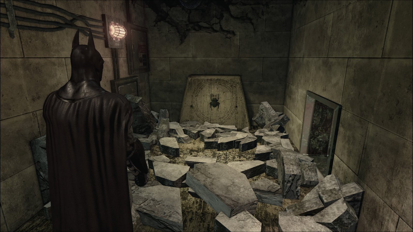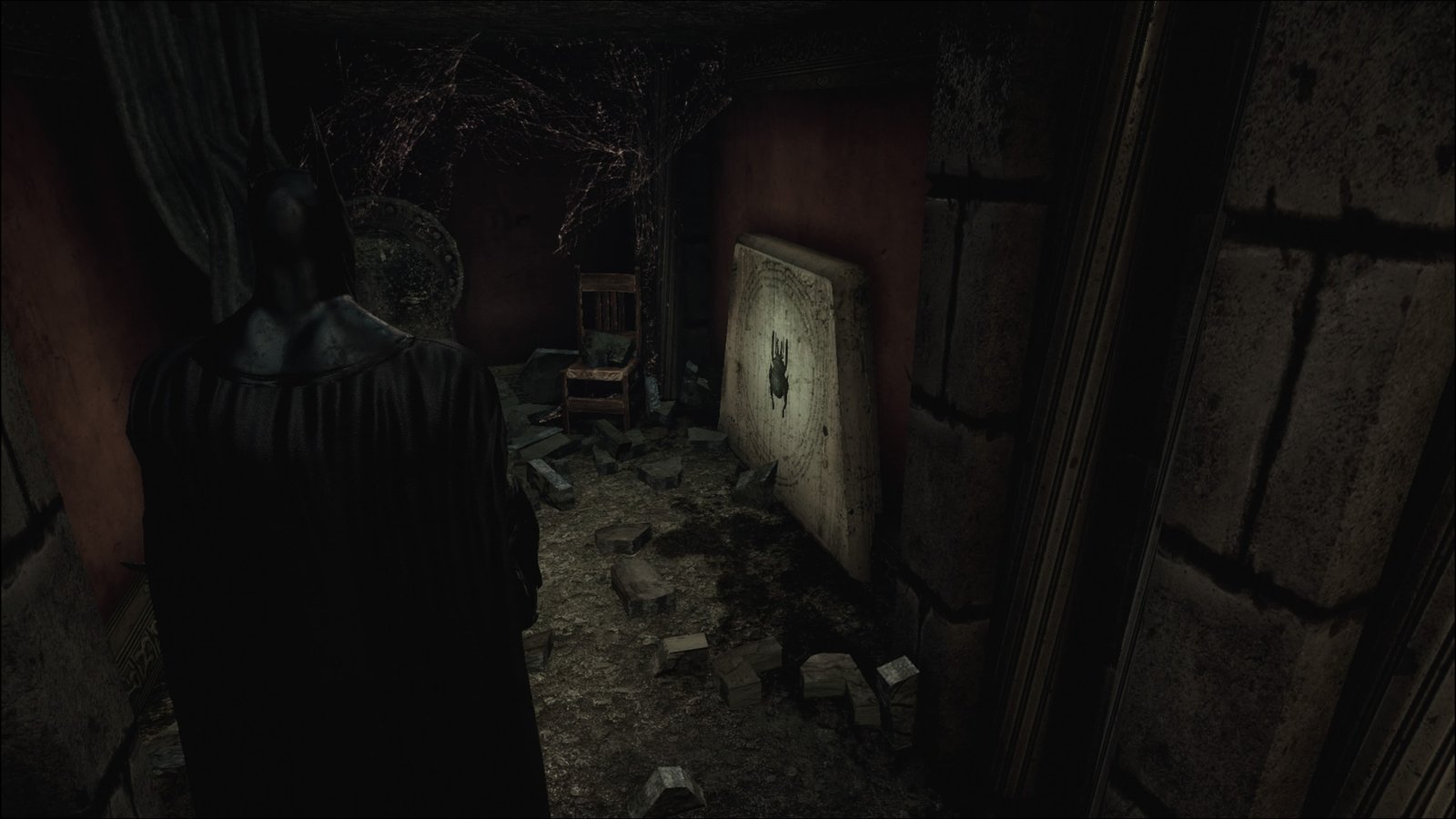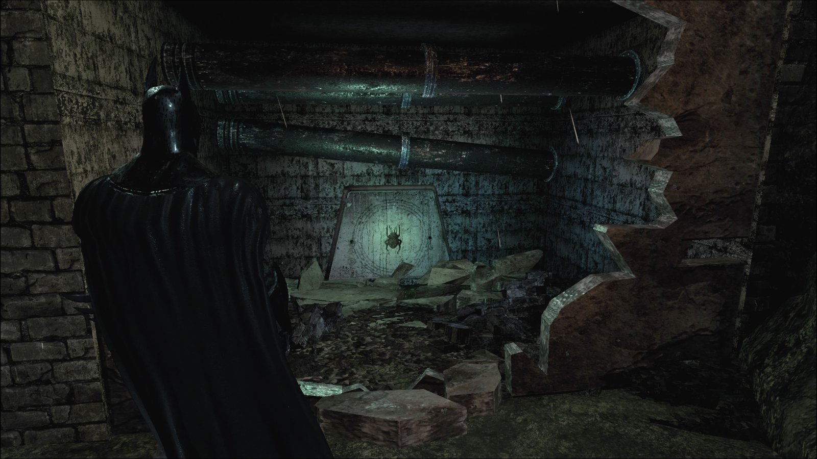 Olhe para a parede leste, acima do corpo, e encontrará uma grade no alto. Use a Bat-Garra para remover a grade, e suba ao duto de ventilação com o Arpéu para pegar o Troféu do Charada (Cavernas 1/17). Volte e vá para o sul. Examine a porta para ver uma cena assustadora, então siga para o norte, destruindo as 3 Dentaduras do Coringa no caminho. Olhe para a parede oeste usando o Modo Detetive para identificar uma parede frágil. Destrua-a e pegue o Troféu do Charada (Cavernas 2/17). Continue seguindo para o norte e entre na porta ao final para acessar uma nova área.