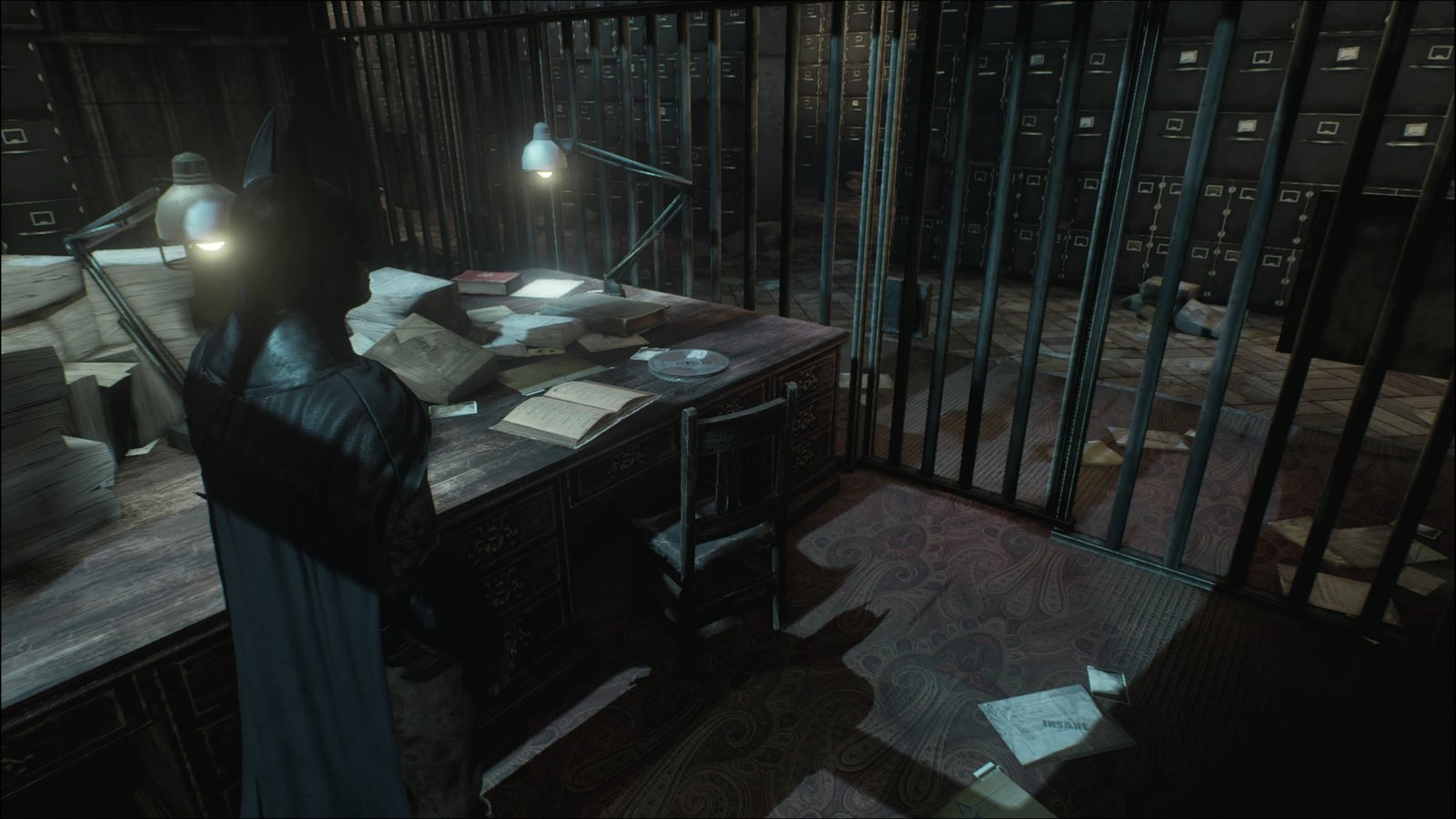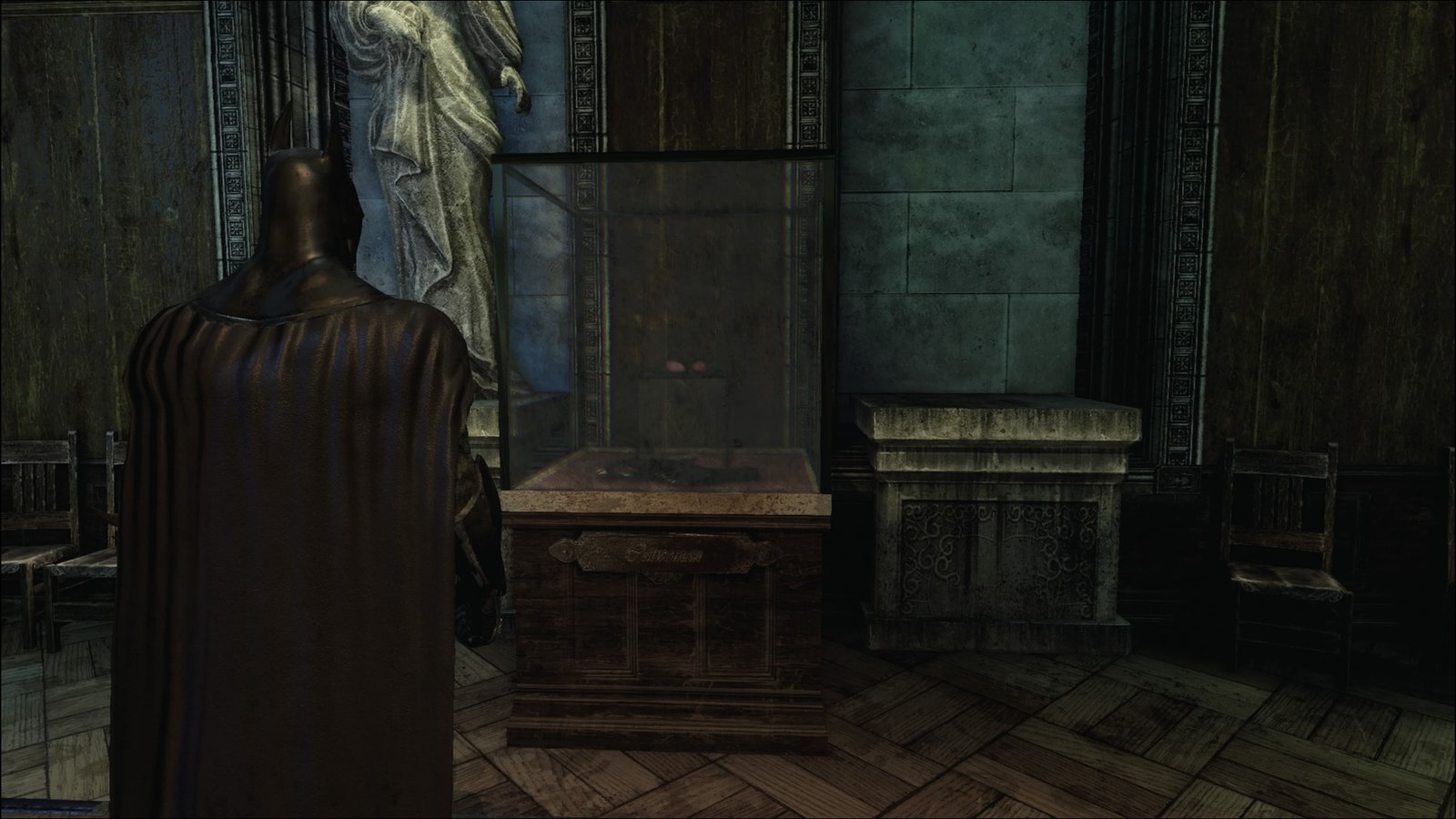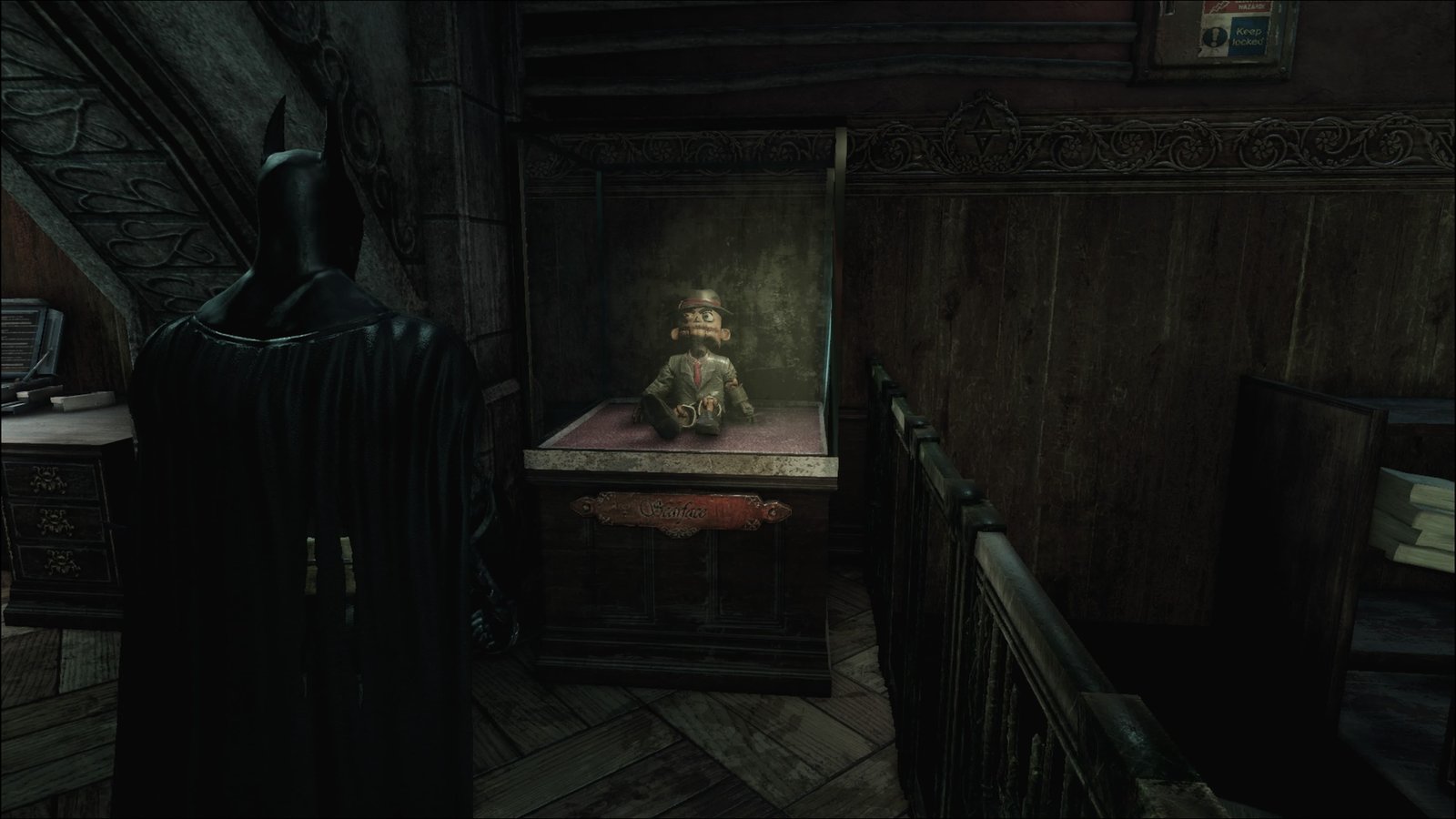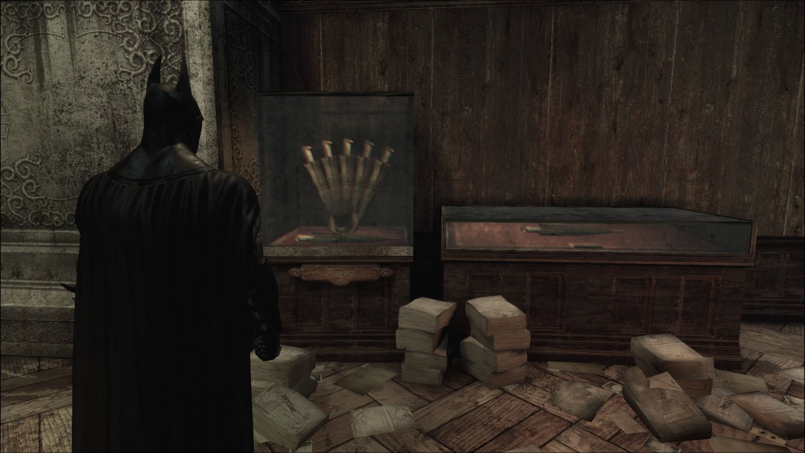 Daqui de cima, observe os 2 Capangas e o Capanga Armado no andar de baixo. Ataque primeiro o armado, e então acabe com os outros dois. Desça as escadas e vá para o lado leste das escadas para ver uma grade na parede. Remova a grade e entre no duto de ventilação para encontrar o Troféu do Charada (Mansão Arkham 1/9). Agora, antes de entrar na porta norte, olhe para cima e verá uma bancada em que poderá subir. Suba na bancada usando o Arpéu e olhe para cima para ver a grade de um duto de ventilação. Arranque-o com a Bat-Garra e suba no compartimento secreto para encontrar a Crônica de Arkham (Mansão Arkham 1/3).