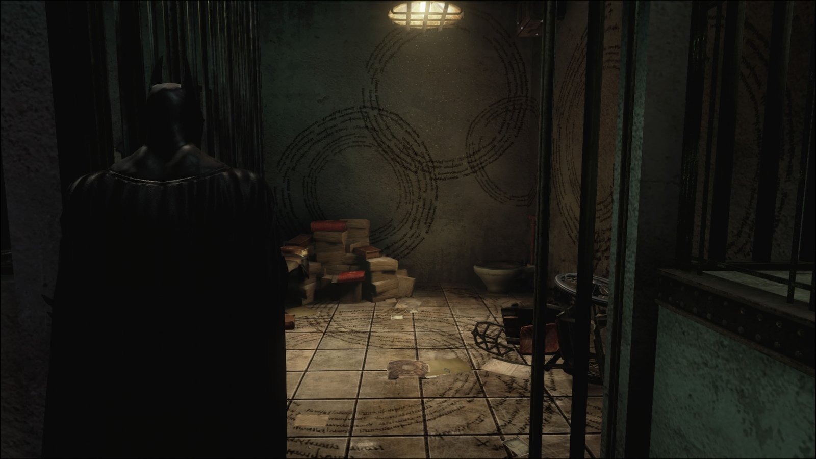 Siga para o norte e suba a escada à direita. Arranque a grade da parede e entre no duto de ventilação. Ao sair do outro lado, destrua as 2 Dentaduras do Coringa para completar o Desafio (Mansão Arkham 1/3). Vá para a cela ao lado e tire uma foto para resolver o Enigma (Mansão Arkham 2/9).
