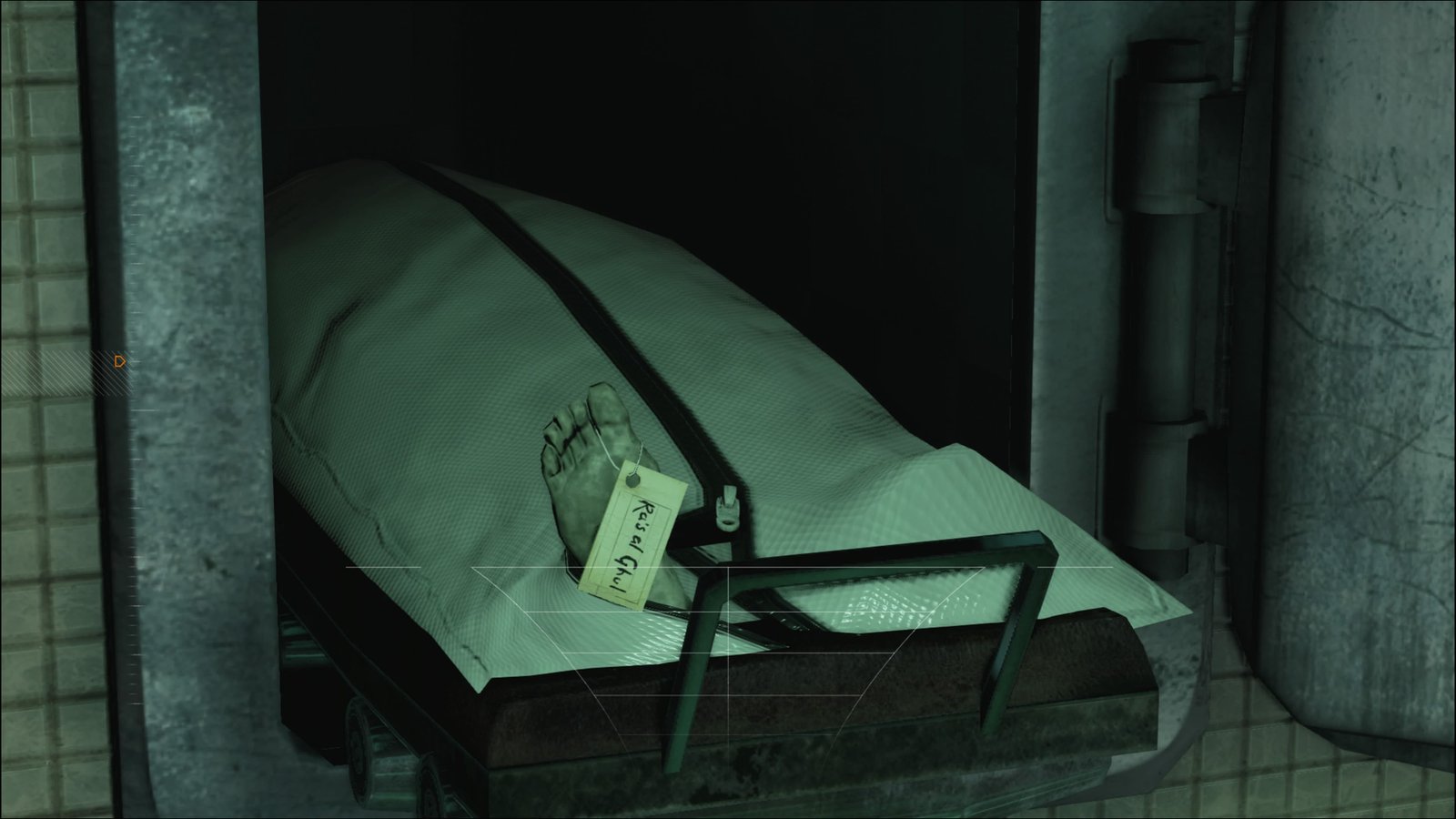 Saia com cuidado, e verá um Capanga Armado e 2 Capangas de costas para você. Elimine o armado primeiro, furtivamente, depois cuide dos outros. Agora suba a escada ao leste, e verá algumas câmaras de cadáveres na parede leste. Olhe atentamente para a placa identificativa no cadáver que está exposto fora da câmera, e tire uma foto para resolver o Enigma (Mansão Arkham 3/9).