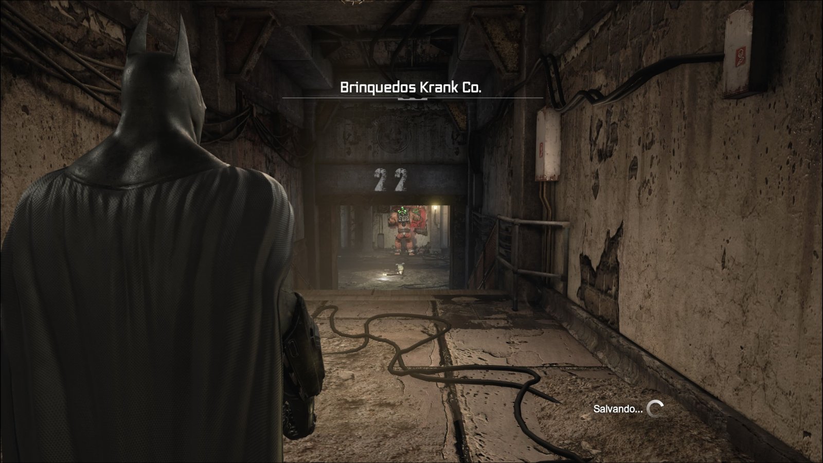 Batman agora está em um cenário interno, que é separado por salas. Acompanhe sempre o mapa para se localizar melhor. Batman estará sobre uma corda bamba. Plane para a abertura adiante e siga para a direita. Corra e derrape pelo trecho estreito, e então salte sobre os obstáculos. Ao final da plataforma, use a Bat-Garra para abrir a escotilha adiante, o que irá apagar as chamas. Desça e então se pendure na beirada para conseguir se esgueirar para o lado. Levante-se, ande pelo parapeito e pule para o outro parapeito. Na outra plataforma, ative o Modo Detetive para ver um piso frágil. Exploda-o com o Gel Explosivo e desça pelo buraco.