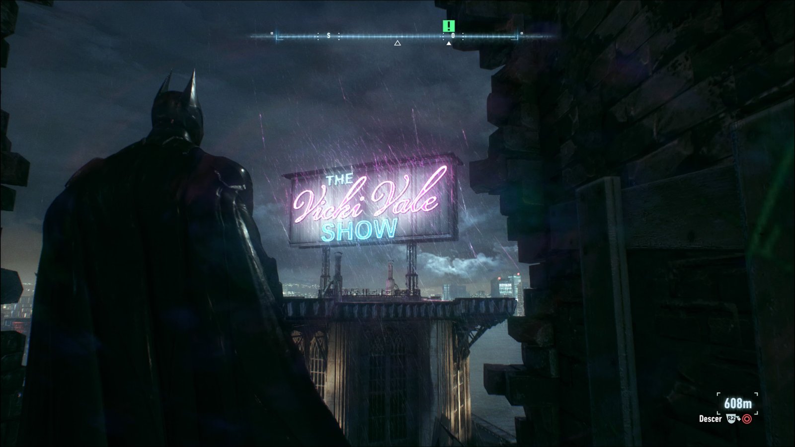 Há mais uma missão que poderemos iniciar agora, mas o começo é bem randômico. Simplesmente voe ao redor e suba nos prédios altos usando o Arpéu. Em algum momento, Batman irá encontrar um morcego gigante em um dos prédios. Trata-se do Morcego Humano, e ao encontrá-lo, irá iniciar a Missão Secundária: Criatura da Noite. Nosso primeiro objetivo é capturá-lo para obter uma amostra de sangue. Ative o Modo Detetive, e conseguirá saber a localização dele por meio de seus gritos. Voe na direção dele, e use suas técnicas de voo e Arpéu Avançado para conseguir chegar até ele. Verá uma cena, em que o Batman irá derrubá-lo e obter a amostra de sangue automaticamente. Alfred irá analisar o sangue, e descobrir a identidade do Morcego Humano. A próxima localização para continuar com essa missão secundária fica lá em Bleake Island, então vamos deixar isso para outro momento.