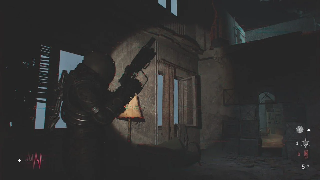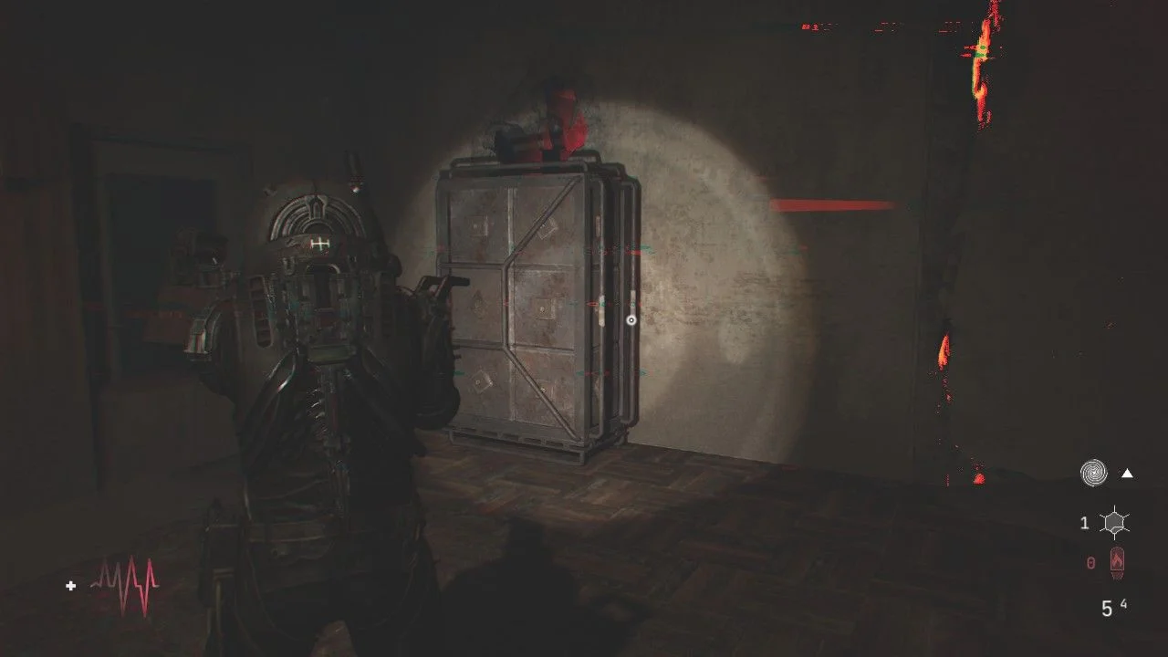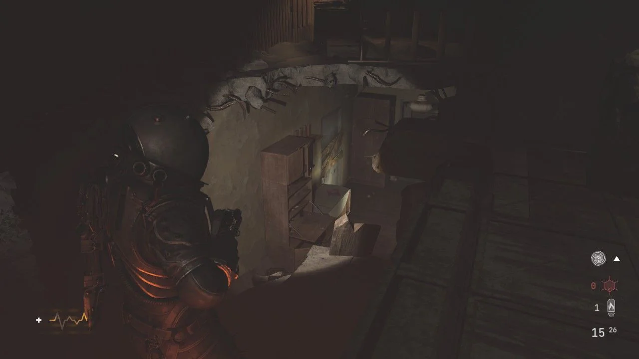 Antes de seguir pela porta adiante, siga até o banheiro à esquerda e pela janela da porta, elimine outro Wallcorpse, passe pela porta aqui para chegar em um pequeno corredor com uma caixa em uma mesa ao lado de uma porta, ao se aproximar, um Órfão Mutante sairá da porta, acabe com ele rapidamente. Continue pela porta de onde o inimigo veio e colete os itens, lendo o Arquivo: O Silenciamento, use a placa gravitacional aqui para chegar no andar de cima. Nesse andar, você encontrará uma bifurcação, siga à direita para encontrar uma porta bloqueada, colete o Arquivo: Diário de Rádio, quebre o bloqueio para chegar em uma sala cheia de corpos. Use o sensor da sua arma para verificar quais estão vivos e quando terminar com eles, passe pela porta aqui.