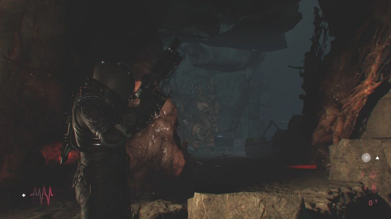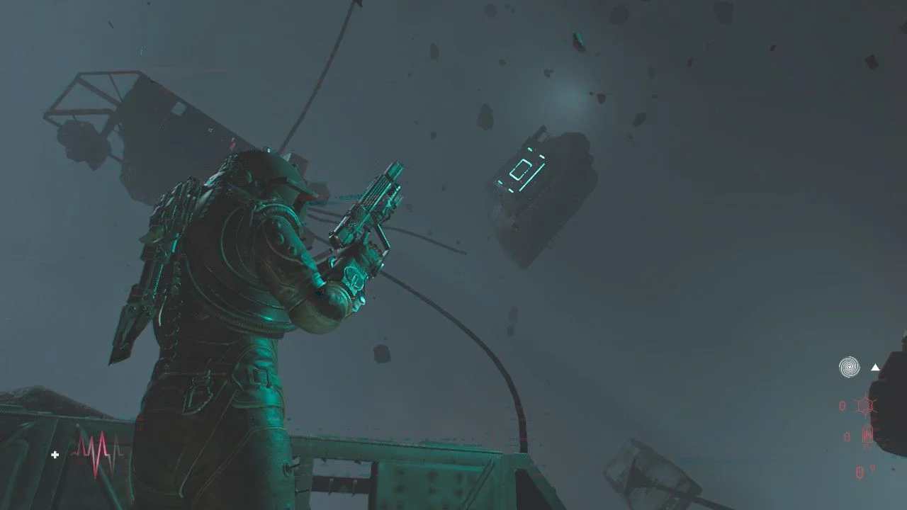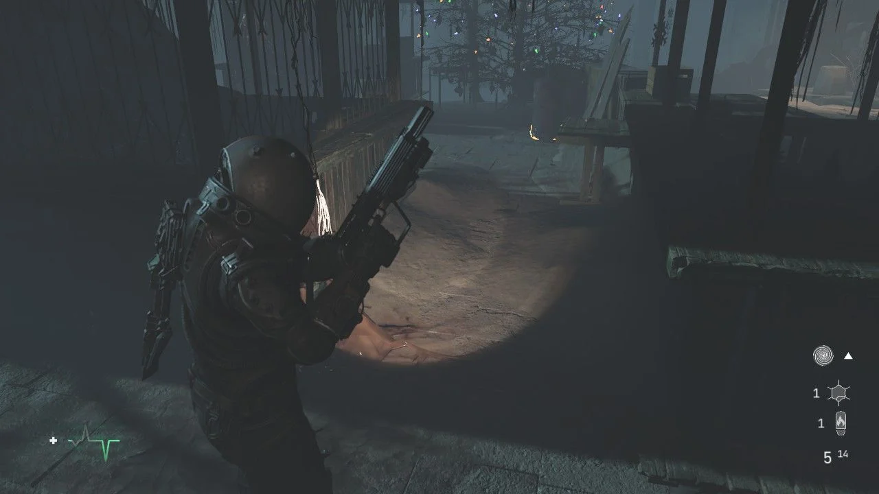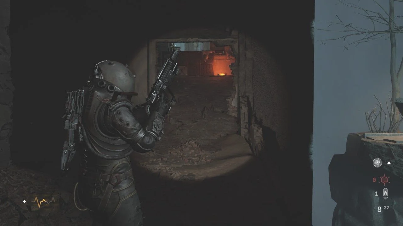 Antes de seguir pela porta adiante, siga até o banheiro à esquerda e pela janela da porta, elimine outro Wallcorpse, passe pela porta aqui para chegar em um pequeno corredor com uma caixa em uma mesa ao lado de uma porta, ao se aproximar, um Órfão Mutante sairá da porta, acabe com ele rapidamente. Continue pela porta de onde o inimigo veio e colete os itens, lendo o Arquivo: O Silenciamento, use a placa gravitacional aqui para chegar no andar de cima. Nesse andar, você encontrará uma bifurcação, siga à direita para encontrar uma porta bloqueada, colete o Arquivo: Diário de Rádio, quebre o bloqueio para chegar em uma sala cheia de corpos. Use o sensor da sua arma para verificar quais estão vivos e quando terminar com eles, passe pela porta aqui.