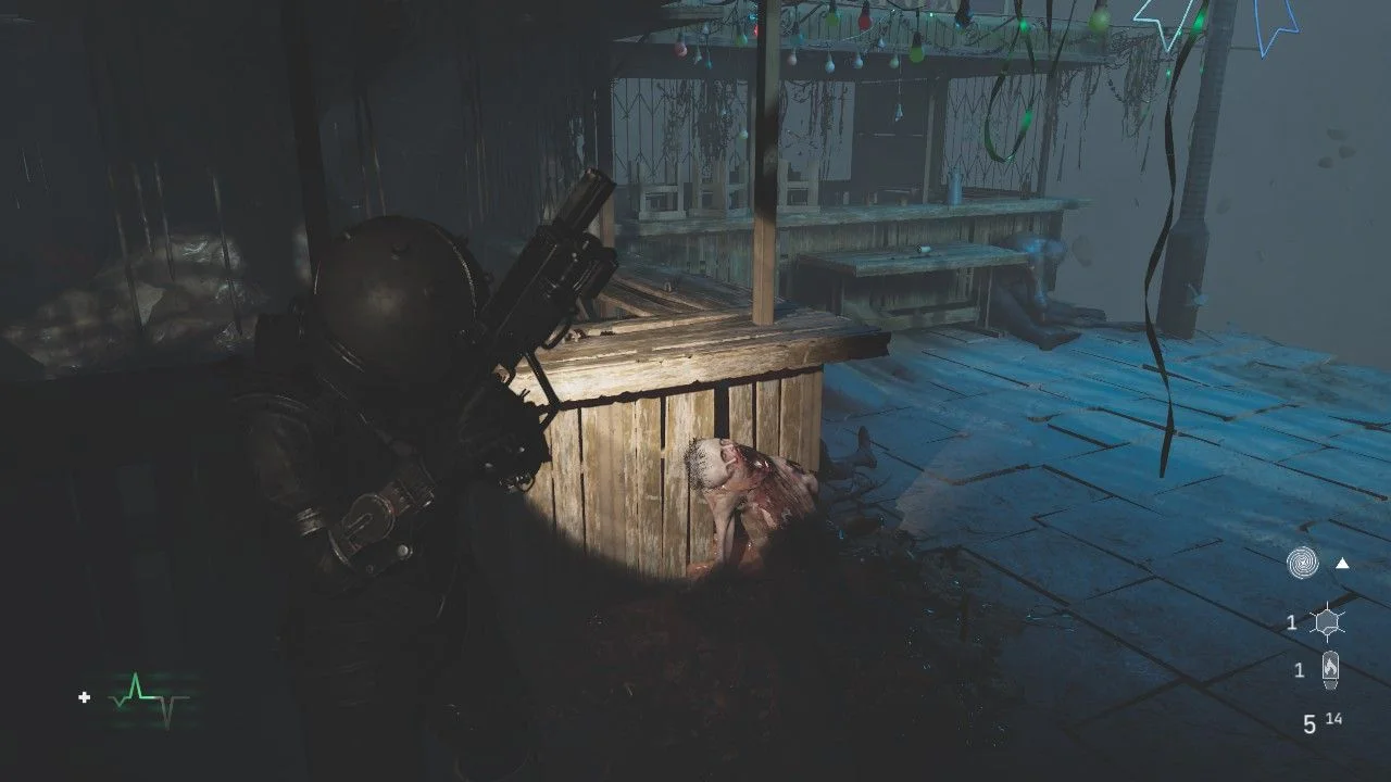 Você estará em um pequeno centro comercial, você já deve ter notado a criatura que nos espreita desde que cegamos nessa locação, ela está aqui também 👀. O local está cheio de itens entre os corredores, bem como, alguns corpos, não colete os fusíveis que encontrar ainda, seguindo em frente, você encontrará um portão fechado e próximo dele, uma barraca com uma caixa de fusíveis faltando dois deles, precisamos encontrar eles para seguir em frente. Voltando, à esquerda, você encontrará o Fusível (1/2), colete ele. O Fusível (1/2) está a direita, conforme você desce o corredor de costas para a porta trancada, em uma mesa na extremidade, coletando ele, você enfrentará alguns inimigos. Colete todos os itens e use os fusíveis na caixa, o portão se abrirá, ao se aproximar ele fechará e você terá de enfrentar mais alguns inimigos, dentre eles, um Brute.