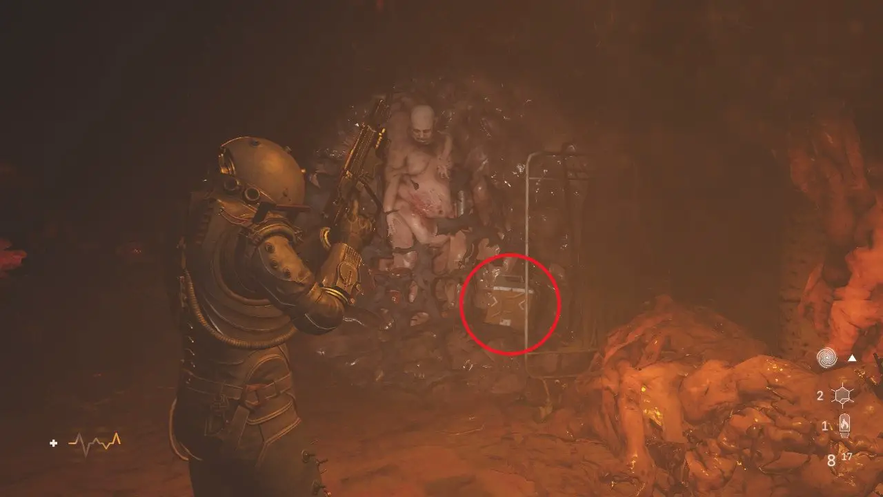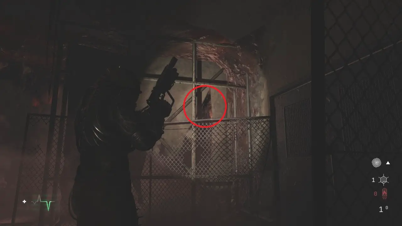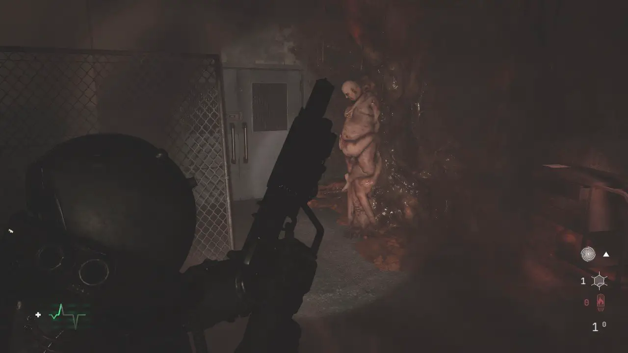 No próximo andar, cuidado com o inimigo explosivo, ao lado da porta, colete o item, entre no cômodo tomando cuidado com mais cistos explosivos e colete os itens dentro, leia o Arquivo: Nota do Funcionário do Necrotério. Quando sair, cuidado com a aranha que aparecerá nas escadas. Desça e você chegará em um corredor contaminado por abominações. Existem muitos cistos aqui, então fique atento, você chegará em uma passagem bloqueada pela biomassa, use o galão de combustível à direita, atirando nele para liberar o caminho. Passe pelo buraco e salte o bloqueio, continue passando pela fresta e atire nos três inimigos que virão rastejando na sua direção.
