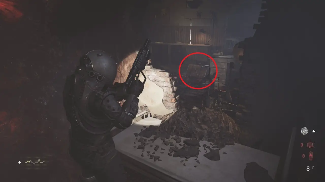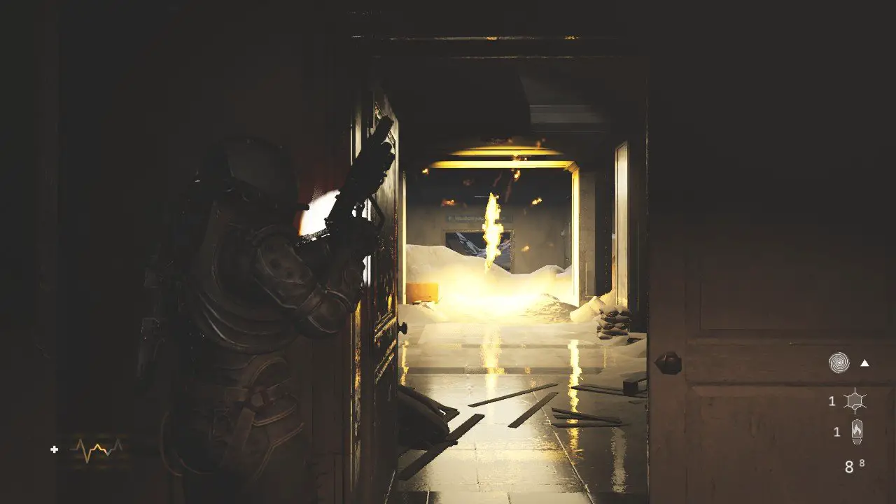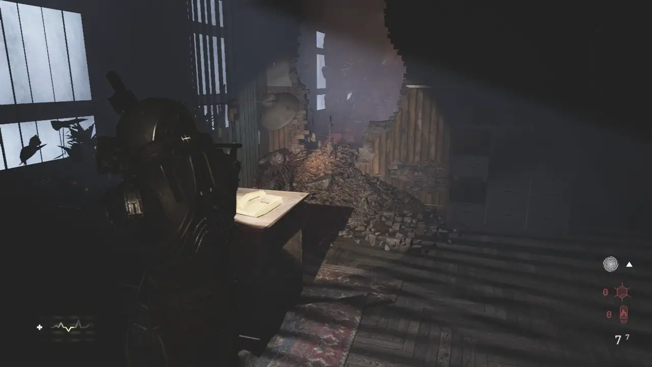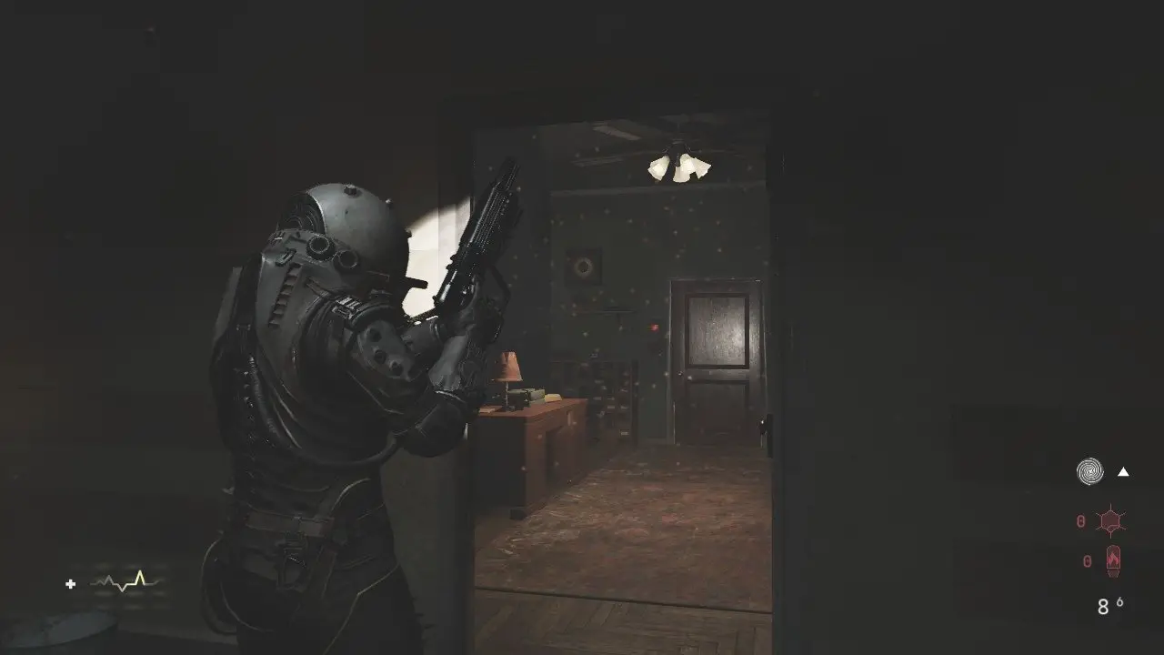 Voltando ao corredor, entre na segunda porta à direita, assim que fizer isso, um inimigo arrombará a porta, elimine ele e entre no banheiro para recolher os itens, volte e entre na porta principal. Chegando no próximo saguão, a porta à direita onde stá a última amostra está trancada, outra porta em frente a está, também está fechada. Siga em frente, tomando cuidado com os dois inimigos Wallcorpses, um está à sua frente e outro atrás da parede quando você avançar. Corte a corrente da porta, entre e salte pela janela quebrada para chegar em uma sala com o Arquivo: O Caso de gabriel Baryka, alguns itens e o Núcleo (24/37). Volte tomando cuidado com o Wallcorpse que acordou, siga pela passagem à direita e abra a porta dupla, você encontrará mais um inimigo preso na parede à direita e outro antes de virar a esquina, não deixe de ler o Arquivo: Uma Nota Amassada no carrinho do lado direito.