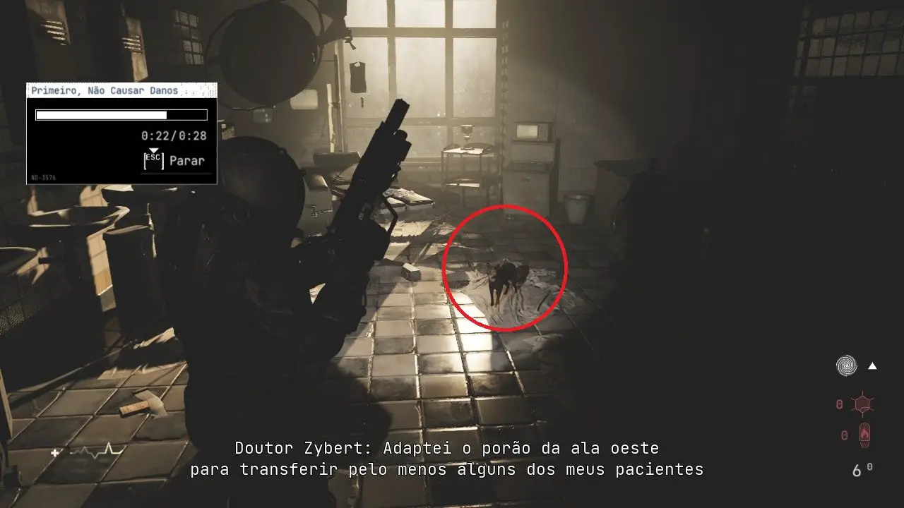 Agora que estamos no Hospital, vamos de fato atrás do Dr. Zybert. Passe pela porta dupla adiante e colete a Gravação: Uma tarefa Sisífica e alguns itens na sala de espera à esquerda. Volte ao corredor e siga em frente, use o alicate para abrir a porta do lado direito, entre e colete os diversos itens no local, volte ao corredor e verifique a porta oposta, você precisará encontrar a chave para conseguir entrar, vamos atrás disso. Continue em frente passando pela porta dupla e vire à esquerda, siga pela porta aqui para entrar em uma nova sala.