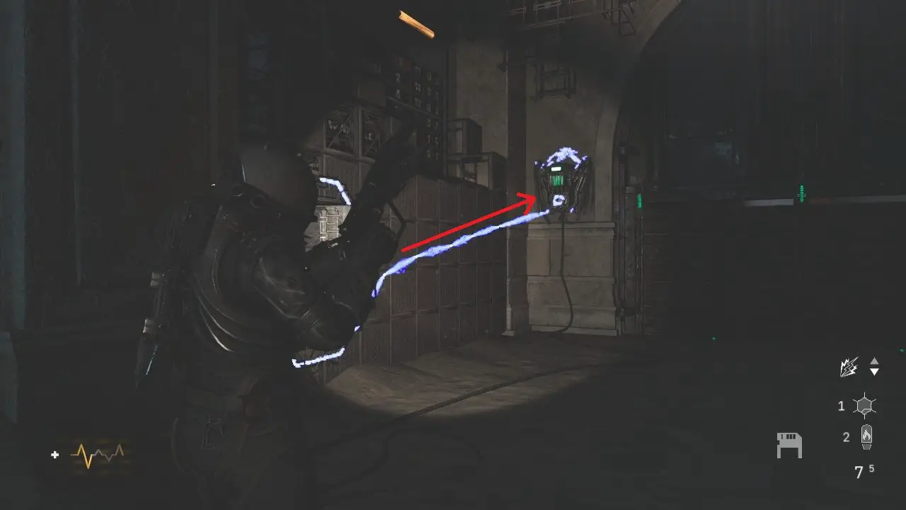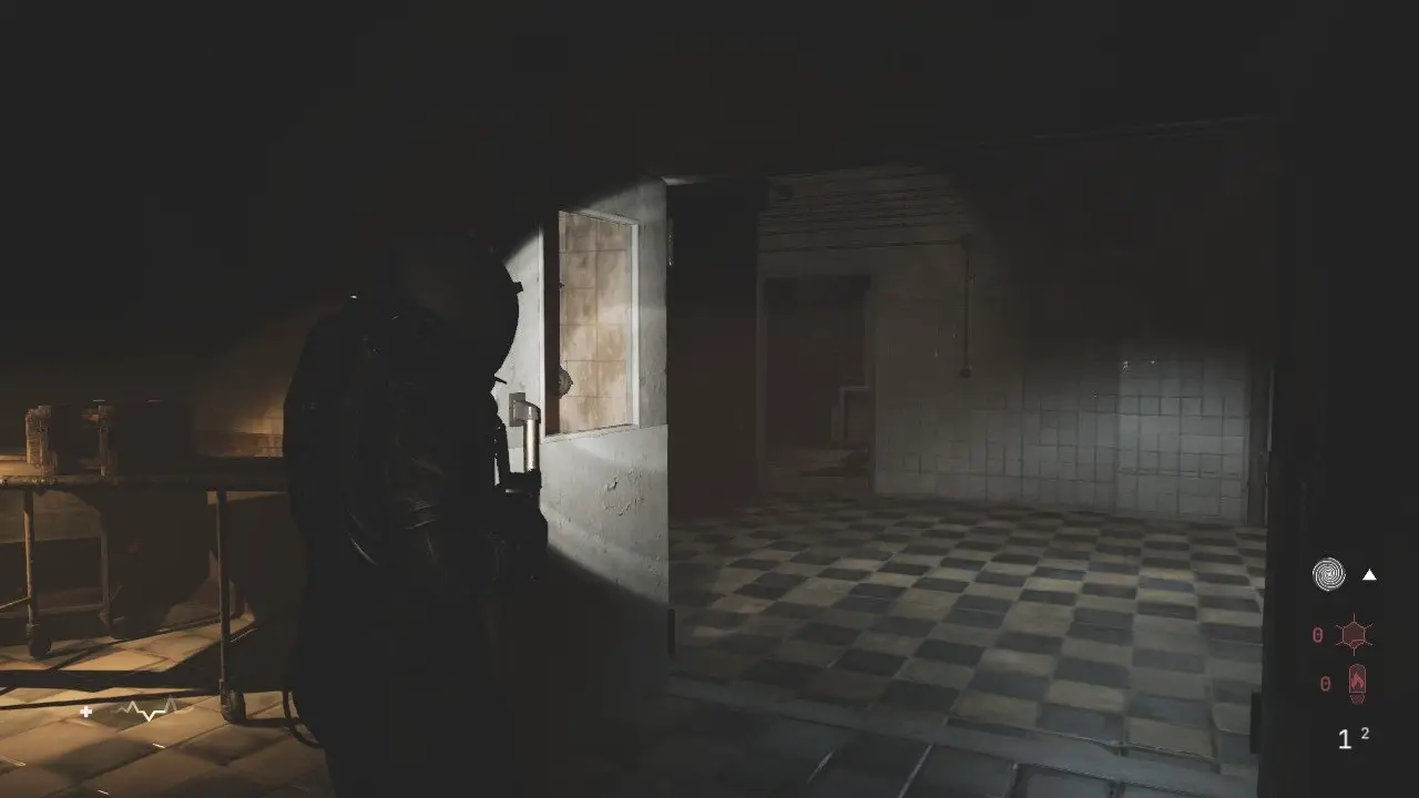 Quando terminar, recolha todos os itens que os inimigos deixarem cair, um ponto de mergulho aparecerá aqui, entre para retornar ao necrotério. Verifique a Orbe de Memória no canto direito antes de seguir em frente. Note que a porta anteriormente fechada no corredor, agora está aberta. Entre e colete os itens, dentre eles, o Termoventilador (22/35) e a Gravação: Uma Imagem Assombrosa. Volte ao corredor principal e use sua nova chave para abrir o cadeado e seguir em frente.