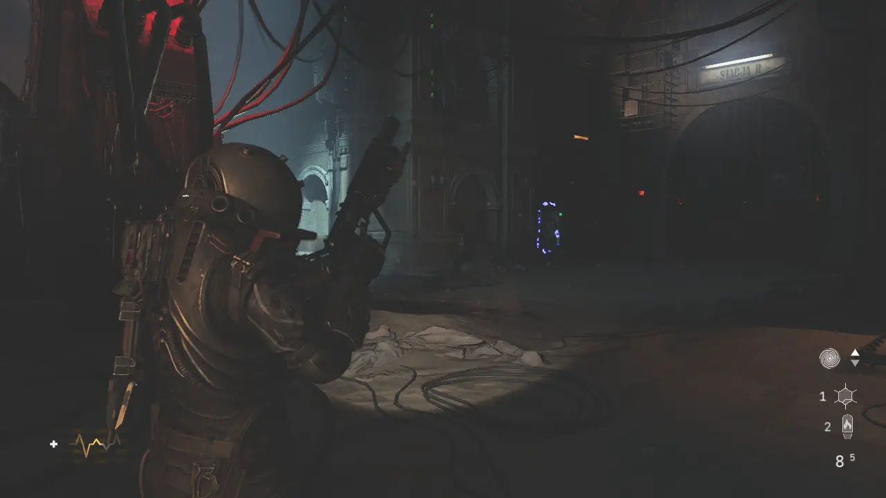 Coloque as três fórmulas que conseguiu na centrífuga, você conseguirá a Toxina Dissolvedora de Biomassa. Voltemos a monstruosidade pulsante que vimos anteriormente. Injete a toxina no coração pulsante e assista a cena, o que houve com Weronika? Vamos descobrir. Volte mais uma vez até o ponto de controle, recolha alguma munição e saúde caso precise, enfrentaremos um inimigo poderoso em breve. Quando estiver pronto, verifique o elavador para acionar uma cena, você cegará no porão.