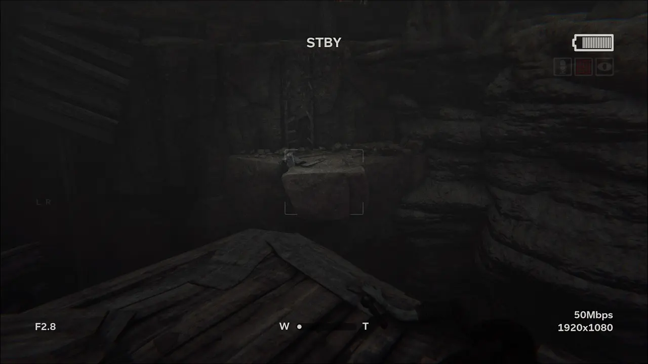 Saindo da caverna, desça a escada e comece a filmar a grande criatura feita de galhos no alto para receber o vídeo Templo da Caverna (26/105). Repare no corpo próximo ao precipício, colete a bateria ao lado dele e note a plataforma de onde podemos saltar para o outro lado do altar. Suba a escada logo a frente para chegar na área mais elevada, entre no túnel e corra até chegar do outro lado, use o modo noturno da câmera quando precisar, encontraremos um corpo enforcado.