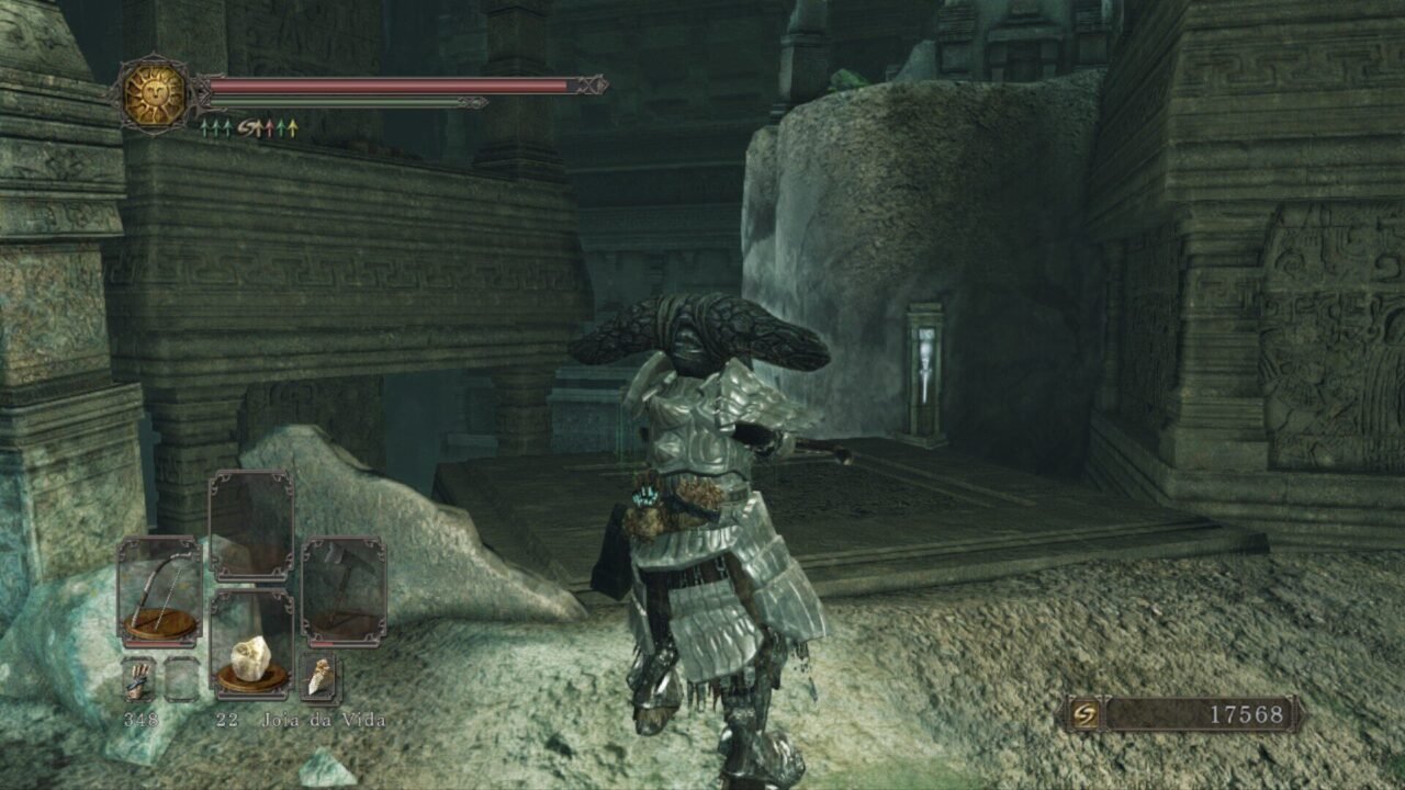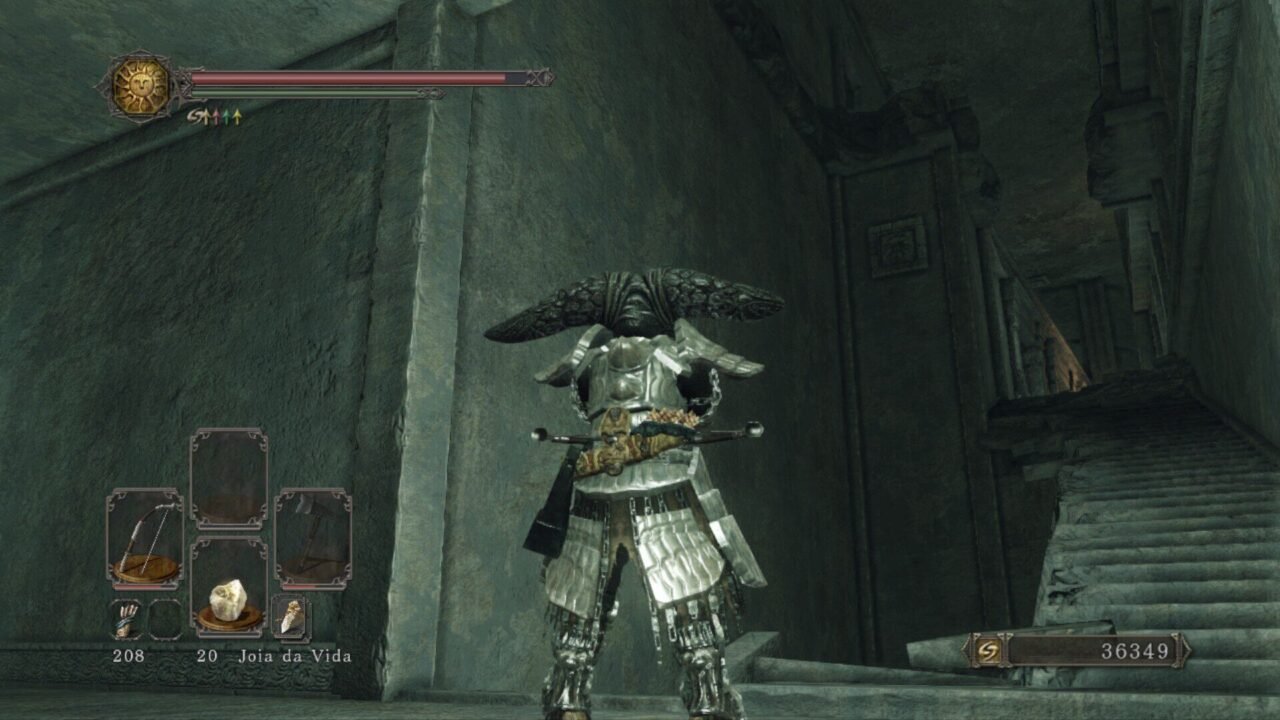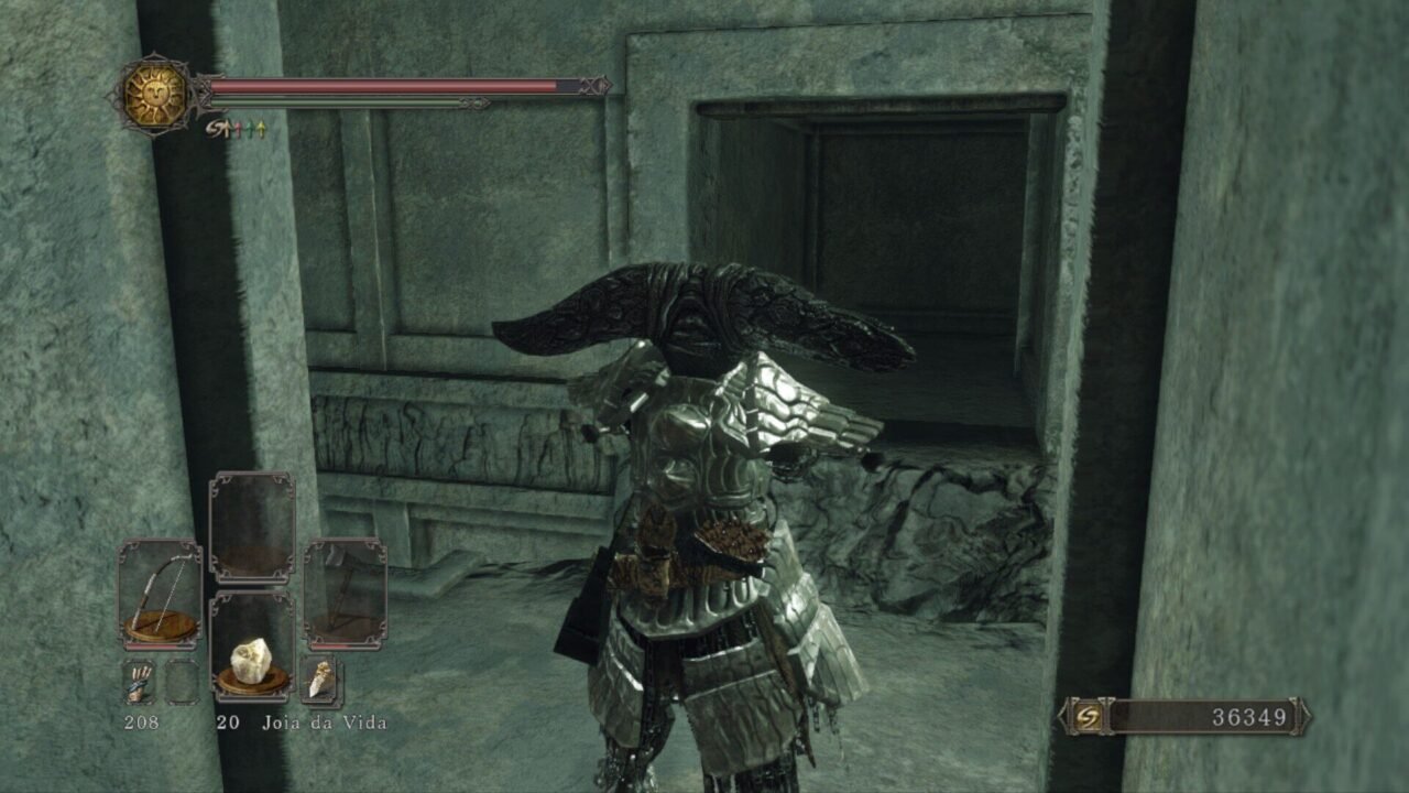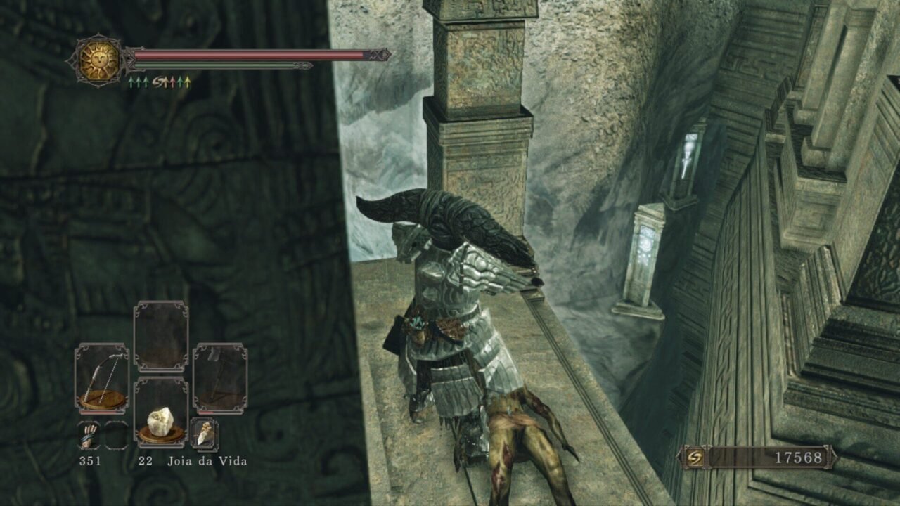 Após usufruir da fogueira, saia e continue à esquerda, descendo o corredor para encontrar mais um soldado patrulhando. Continue pelo corredor esquerdo e, pouco antes do final, entre à esquerda novamente para chegar a uma sala com baús já abertos e um corpo com o Elmo de Sangue de Draco, Armadura de Sangue de Draco, Manopla de Sangue de Draco, Perneiras de Sangue de Draco. Note que pegamos a Espada Grande de Sangue de Draco anteriormente. Você tem todo o set de Draco agora 😋. Saia da sala, vire à direita e siga até perto do final do corredor. Note a plataforma à esquerda, com uma pequena escada no canto. Salte até essa plataforma e não desça a escada aqui. Ao invés disso, salte até o salão abaixo, do mesmo lado da escada descendo (não tente subir a escada ou cairá). Derrote ambos os soldados patrulhando a área e colete a Pedra Suave Pequena, Titanita Cintilante 2x, Grande Alma de Guerreiro Corajoso e o Balsamo de Videira.