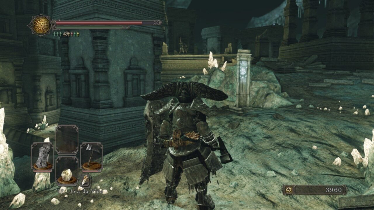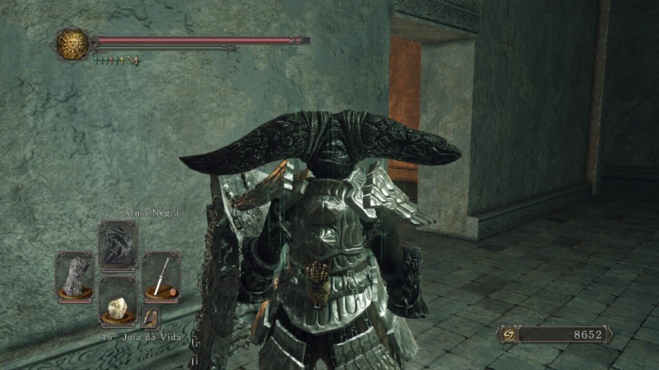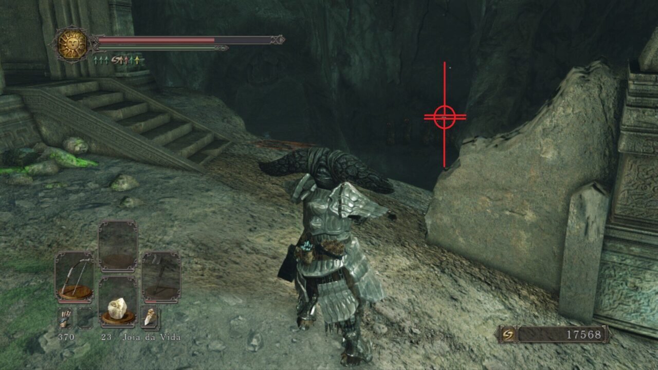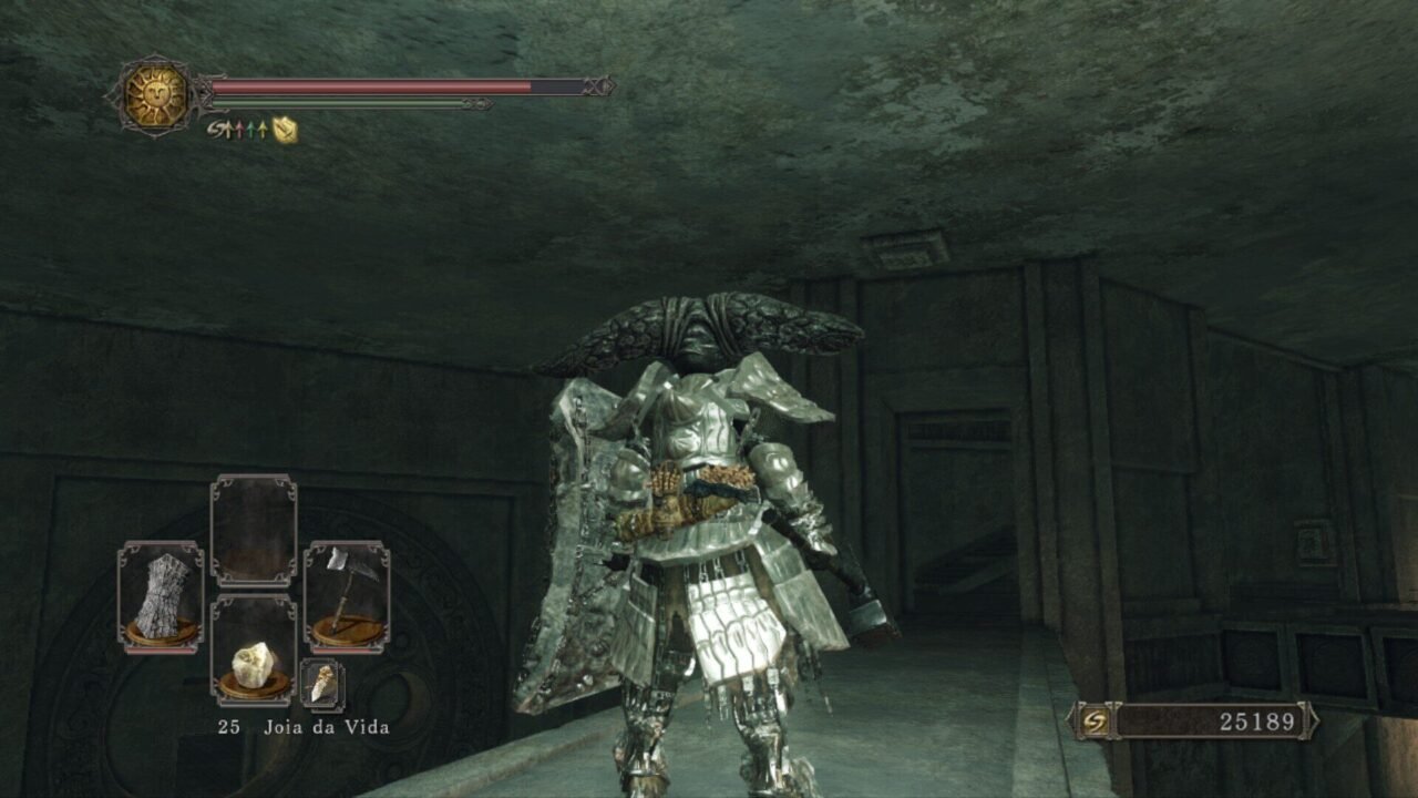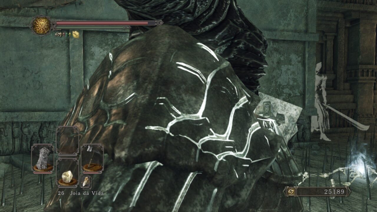 Após usufruir da fogueira, saia e continue à esquerda, descendo o corredor para encontrar mais um soldado patrulhando. Continue pelo corredor esquerdo e, pouco antes do final, entre à esquerda novamente para chegar a uma sala com baús já abertos e um corpo com o Elmo de Sangue de Draco, Armadura de Sangue de Draco, Manopla de Sangue de Draco, Perneiras de Sangue de Draco. Note que pegamos a Espada Grande de Sangue de Draco anteriormente. Você tem todo o set de Draco agora 😋. Saia da sala, vire à direita e siga até perto do final do corredor. Note a plataforma à esquerda, com uma pequena escada no canto. Salte até essa plataforma e não desça a escada aqui. Ao invés disso, salte até o salão abaixo, do mesmo lado da escada descendo (não tente subir a escada ou cairá). Derrote ambos os soldados patrulhando a área e colete a Pedra Suave Pequena, Titanita Cintilante 2x, Grande Alma de Guerreiro Corajoso e o Balsamo de Videira.
