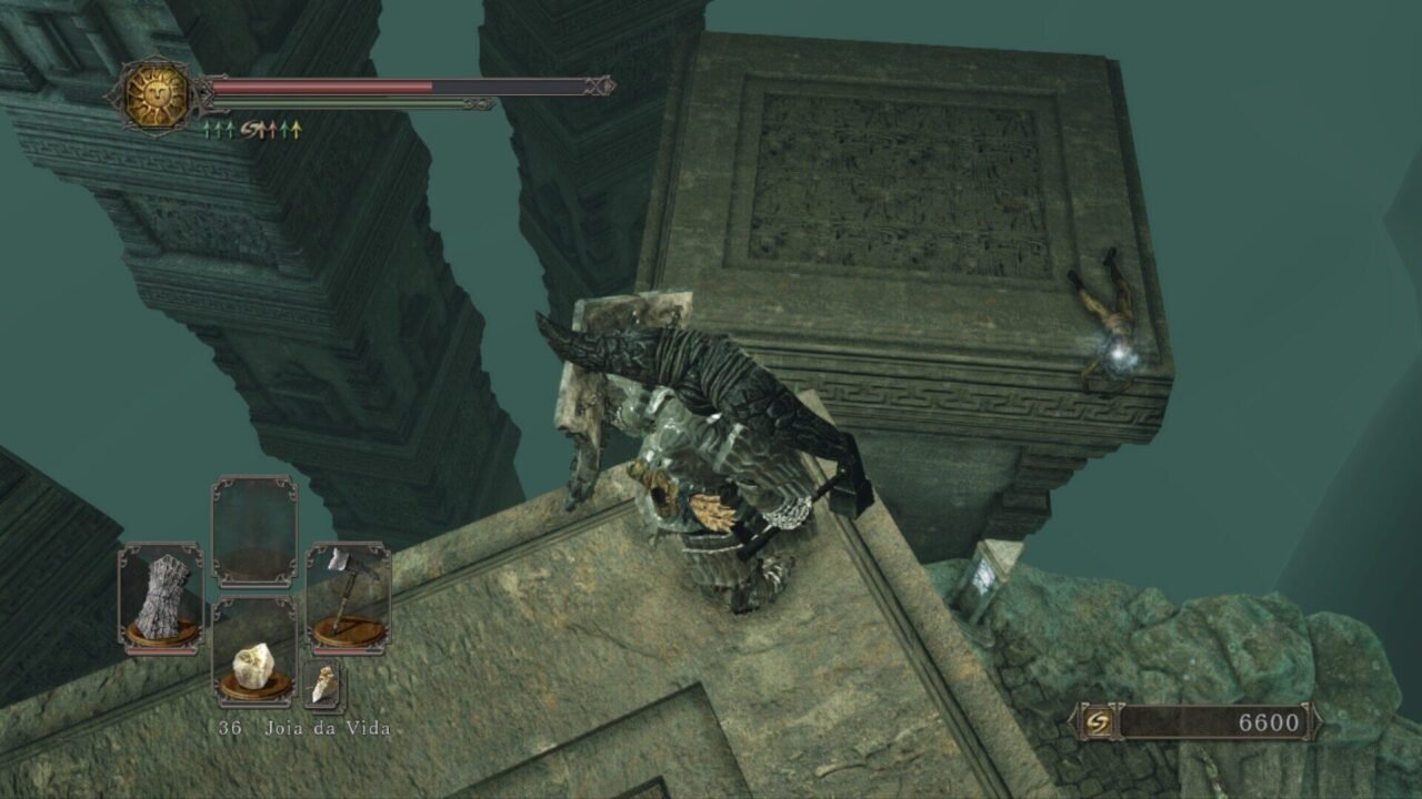 Saia pela porta oposta, caia na plataforma à esquerda e caia na próxima, desça a escada e lide com o inimigo de costas, outro deve vir atrás de você, acabe com ele também. Siga à direita descendo a ponte estreita, no final, entre na construção e colete a Moeda Enferrujada no corpo, desça a escada ao lado da construção para ver um dragão atacar a ponte mais abaixo. Desça até a ponte, mas NÃO atravesse, siga pela beirada da construção quebrando os vasos e, no final, colete a Magia: Concentração de Almas (27/31). Volte e atravesse a ponte, pode seguir tranquilamente, o dragão não vai atacar, se aproxime da parede e a espere abrir, siga em frente no corredor.